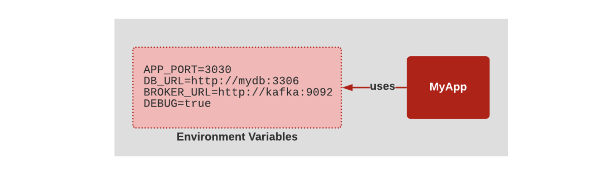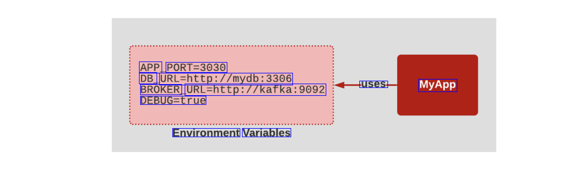 APP PORT=3030 DB URLFhttp://aydb:3306 BROKER URLEhtEp://kafka:9092 uses. MyApp DEBUG=true Environment Variables