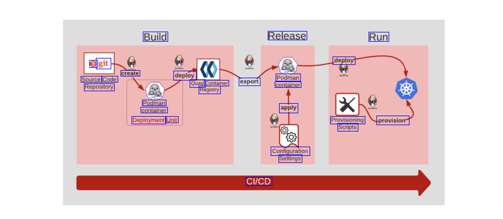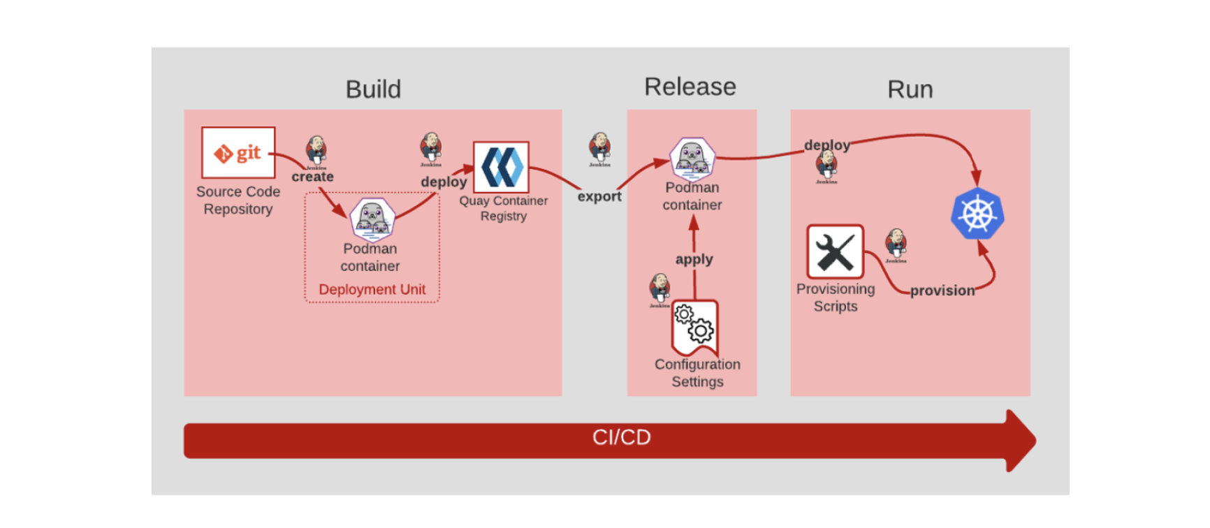 Build Release Run 6 git deploy create deploy Source Code Repository Quay Container export container Podman Registry Podman container Deployment Unit apply Provisioning provision Scripts Configuration Settings CI/CD