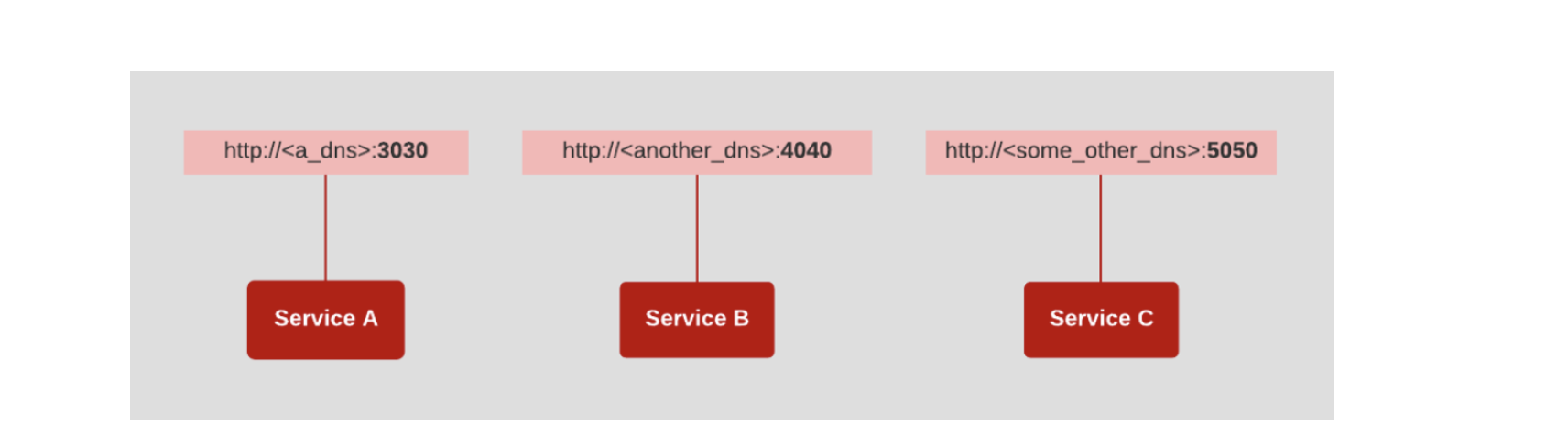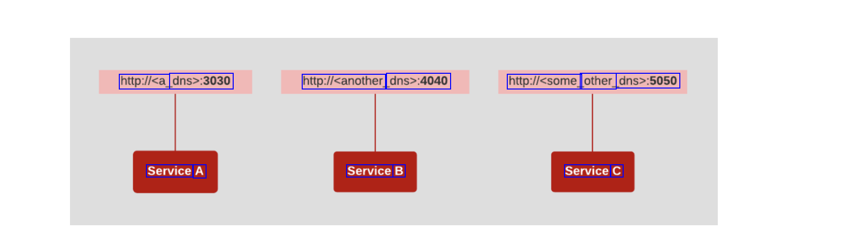 http:lca dns>:3030 http:ll<another dns>:4040 http:llcsome other_ dns>:5050 Service A Service B Service C