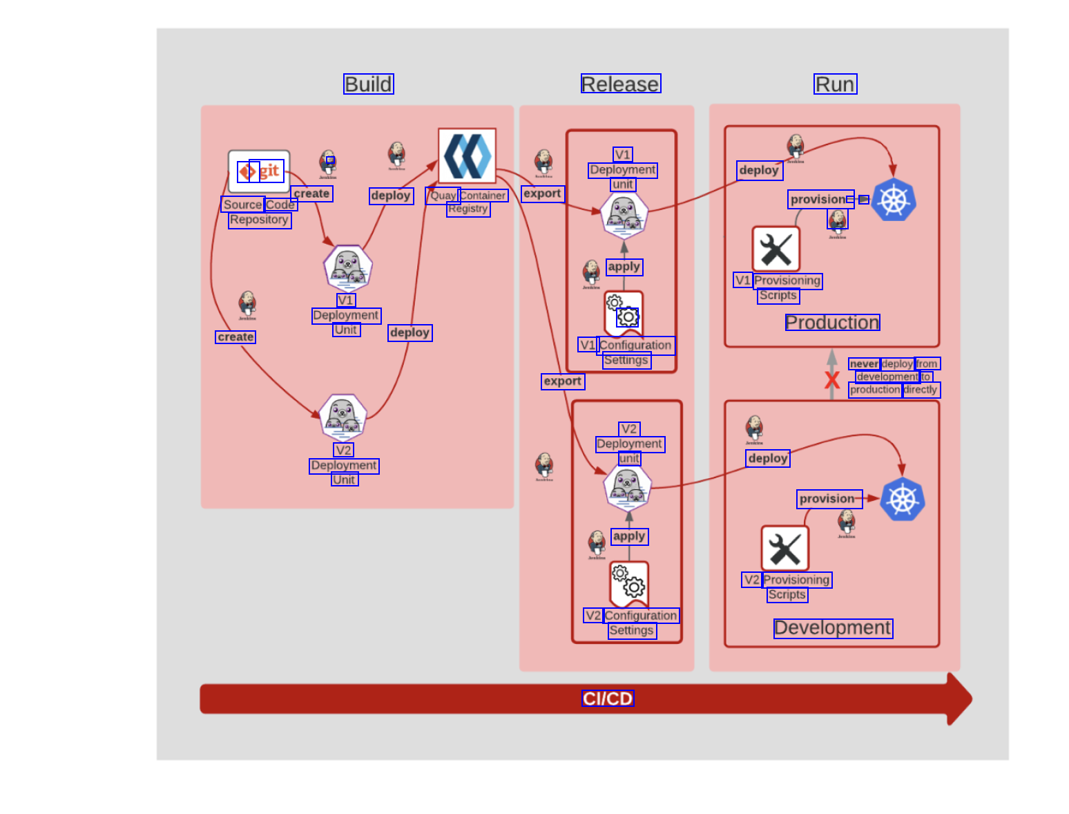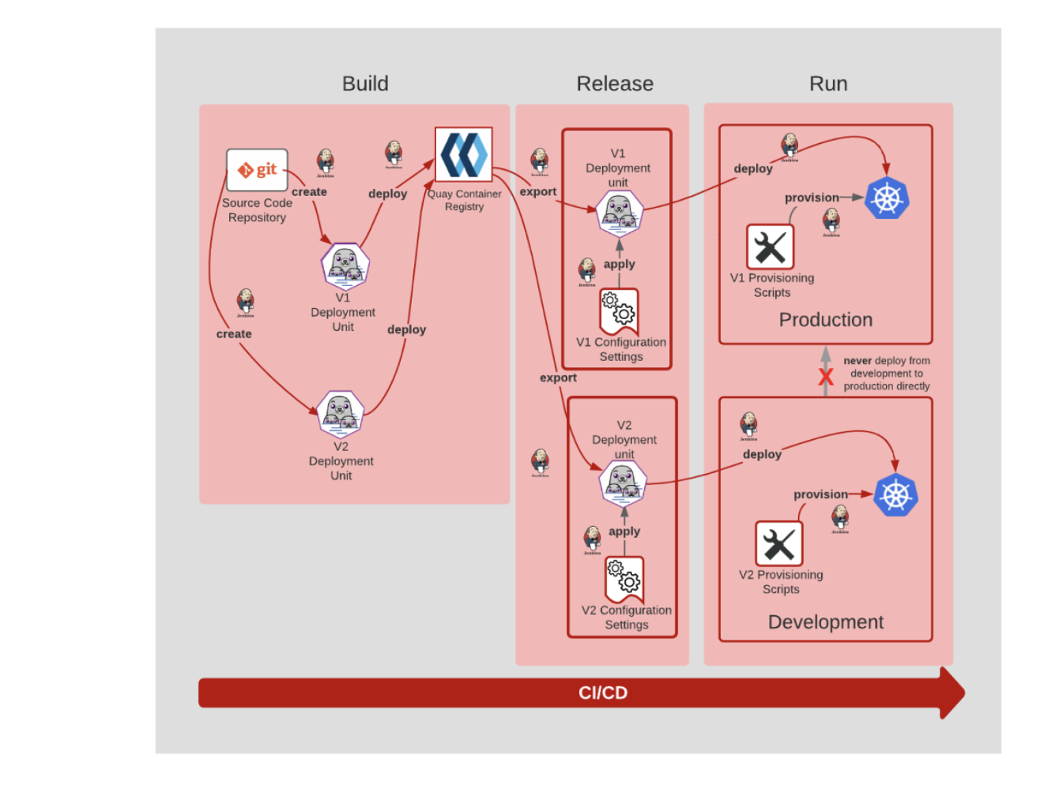 Build Release Run a e git create Source Code Repository V1 Deployment unit deploy deploy Quay Container export Registry - A provision- @ apply O V1 Configuration Settings export V1 Provisioning Scripts Production V1 Deployment Unit deploy create never deploy from development to production directly V2 Deployment unit V2 Deployment Unit deploy provision- apply V2 Provisioning Scripts Development V2 Configuration Settings CI/CD