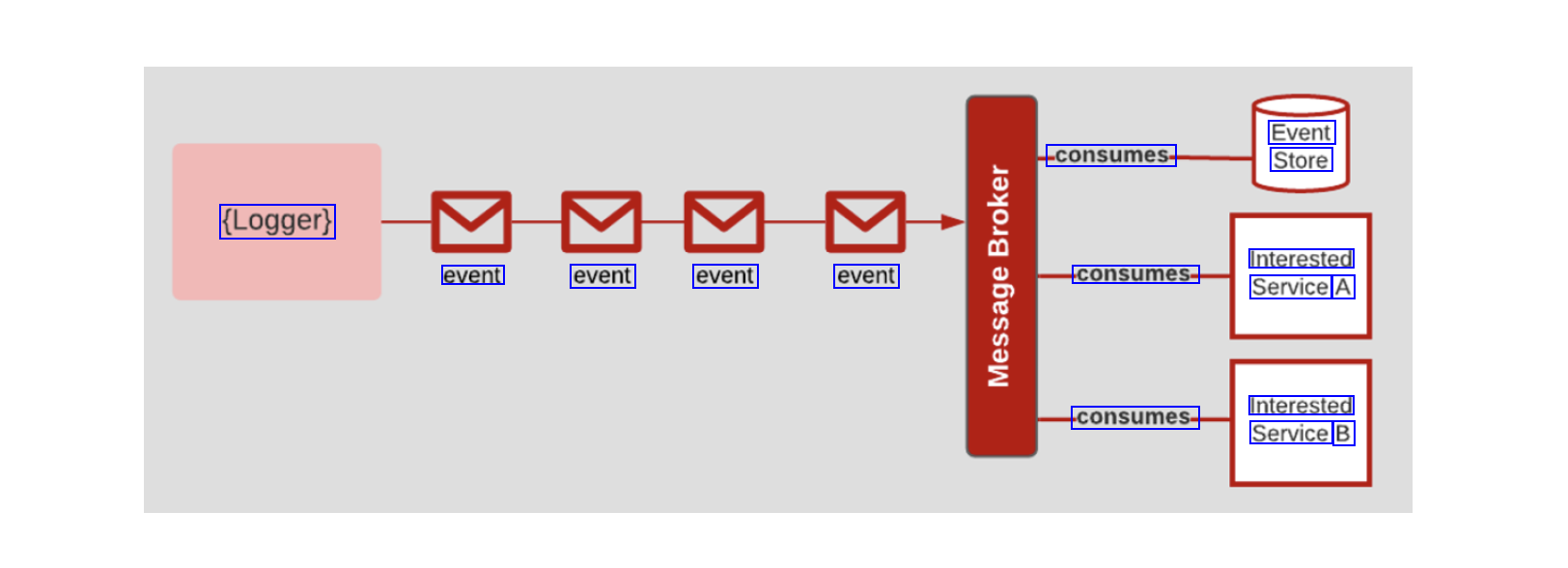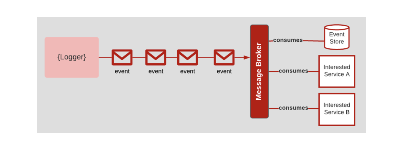 Event Store consumes- (Logger) Interested event event event event consumes- Service A Interested Service B consumes-