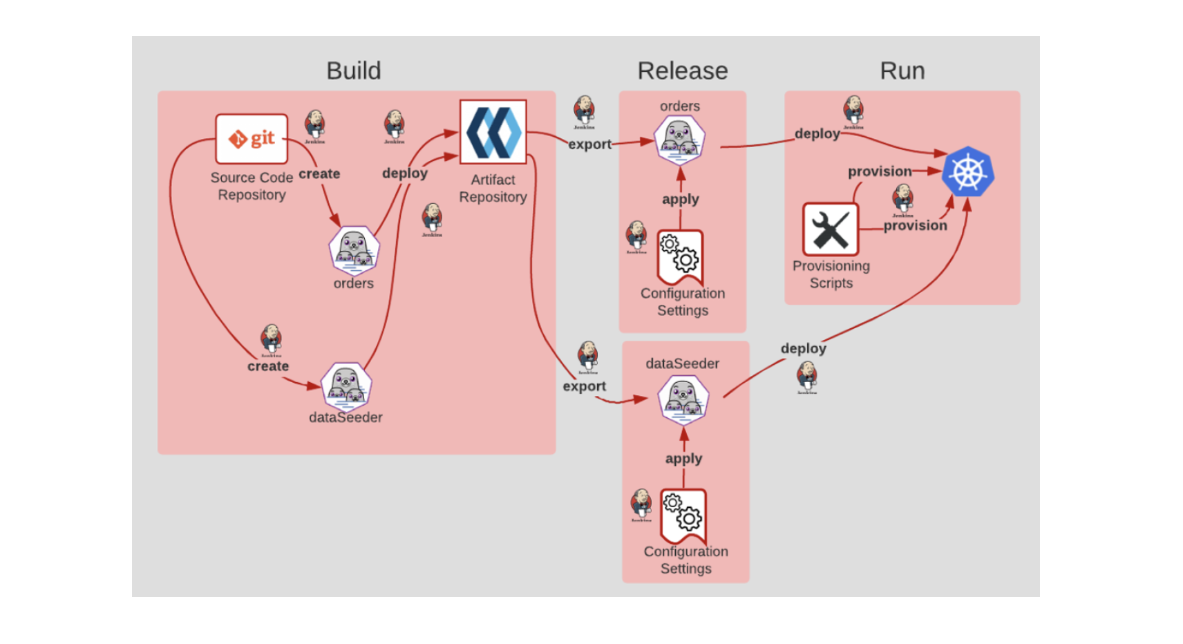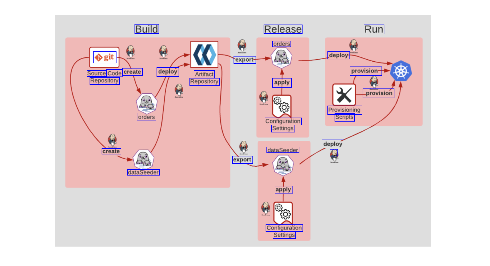 Build Release orders Run Ogit deploy rexport- Source Code create deploy Artifact provision- Repository Repository apply provision Provisioning Scripts orders Configuration Settings deploy create dataSeeder export dataSeeder apply Configuration Settings