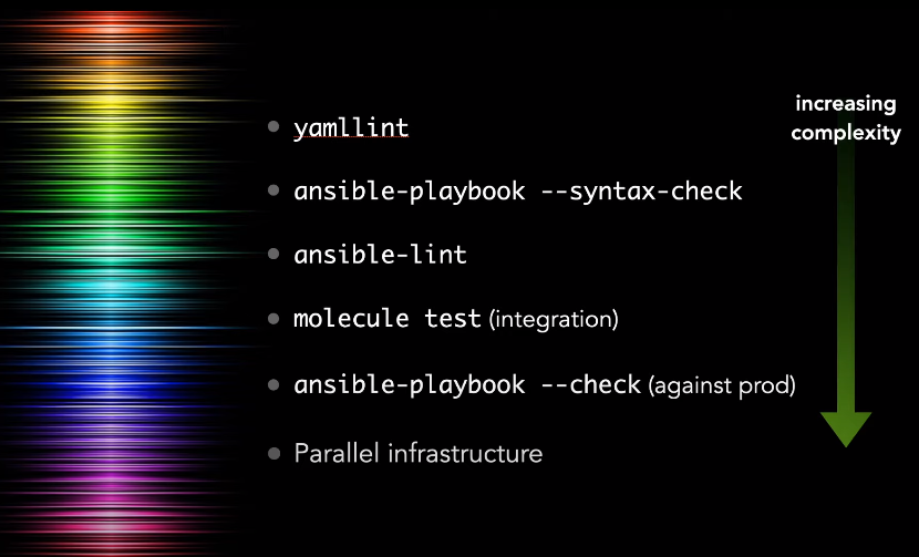 Ansible Testing SpectrumJanuary 14, 2023 | ansible, testingTesting playbooksvalid yaml: yamllint best practices using yamlvalid playbook: check sytanx error andNo notes link to this note