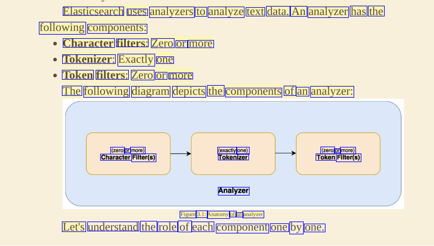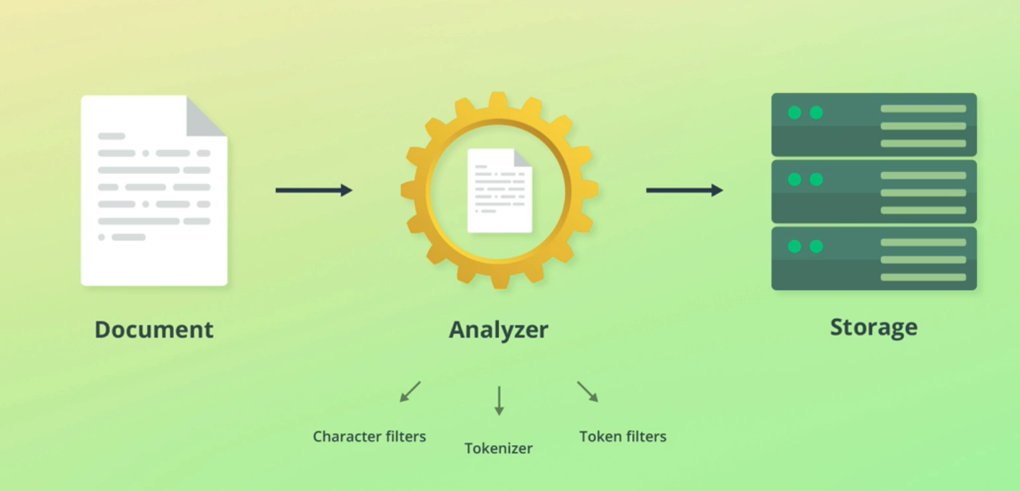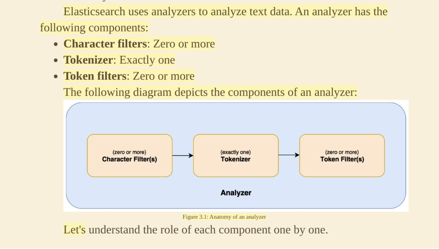 Elasticsearch uses analyzers to analyze text data. An analyzer has the following components: Character filters: Zero or more Tokenizer: Exactly one Token filters: Zero or more The following diagram depicts the components of an analyzer: (zero or more) Character Filter(s) (exactly one) Tokenizer (zero or more) Token Filter(s) Analyzer Figure 3.1: Anatomy of an analyzer Let's understand the role of each component one by one.