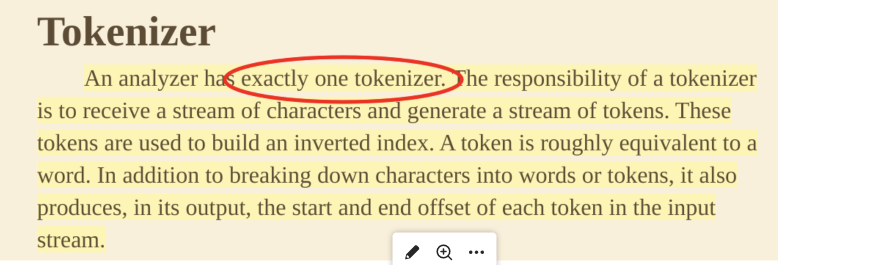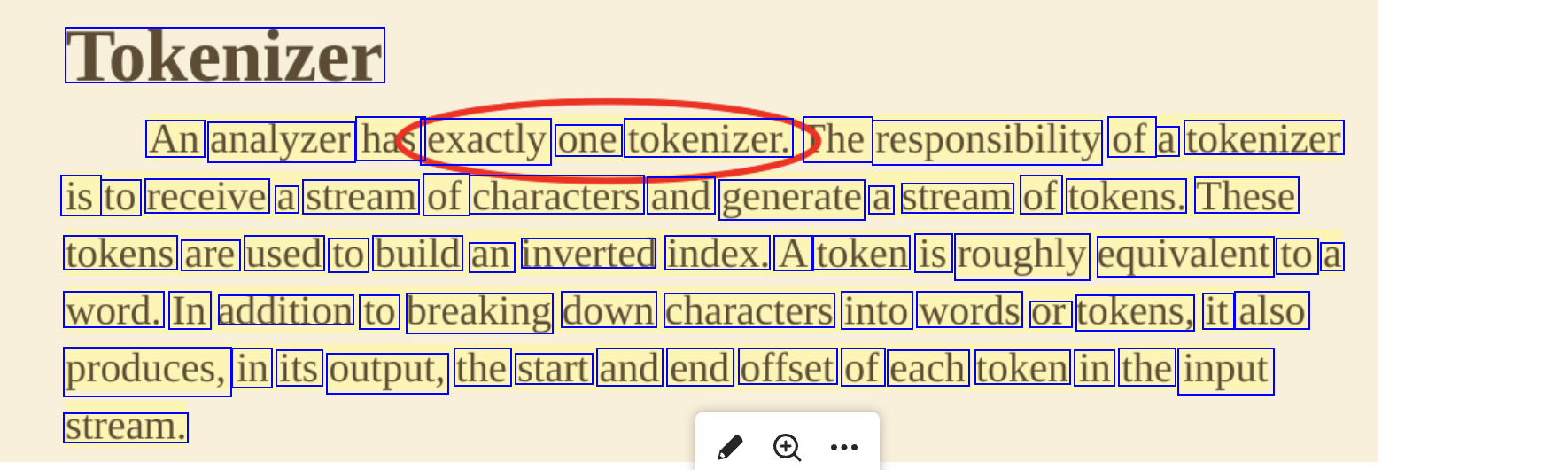 Tokenizer An analyzer has exactly one tokenizer. he responsibility of a tokenizer is to receive a stream of characters and generate a stream of tokens. These tokens are used to build an inverted index. A token is roughly equivalent to a word. In addition to breaking down characters into words or tokens, it also produces, in its output, the start and end offset of each token in the input stream.