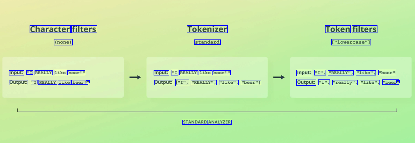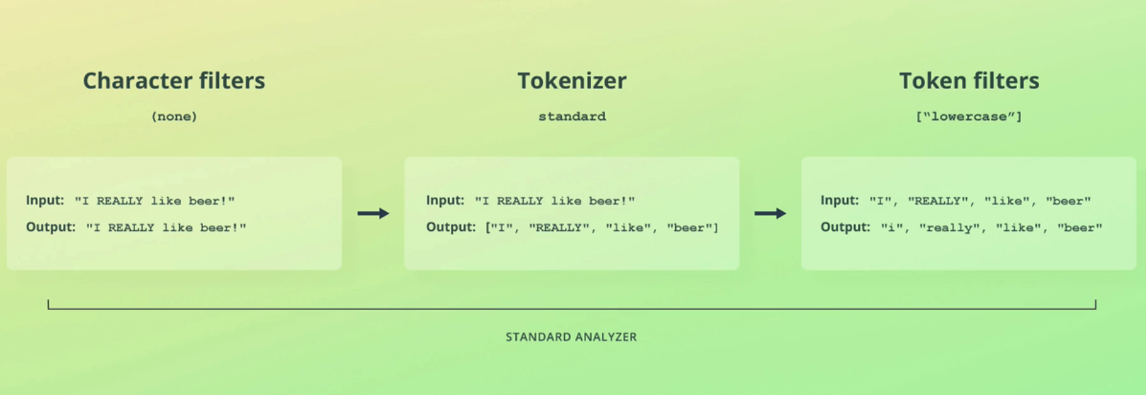 Character filters Tokenizer Token filters (none) standard ["lowercase"] Input: "I REALLY like beer!" Input: "I REALLY like beer!" Input: "I", "REALLY", "like", "beer" Output: "I REALLY like beer!' I1 Output: ["I", "REALLY", "like", "beer"] Output: "i", "really", "like", "beer" I1 STANDARD ANALYZER