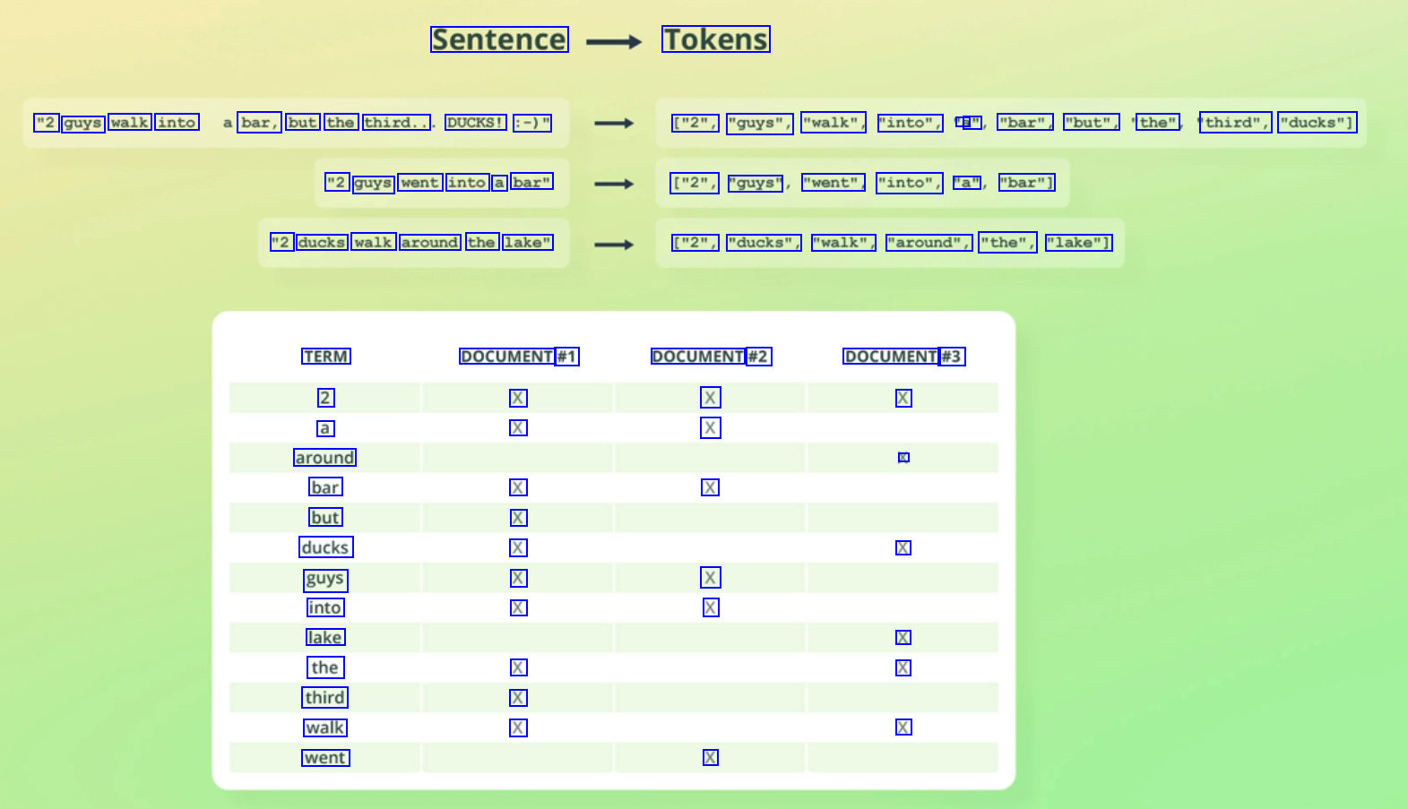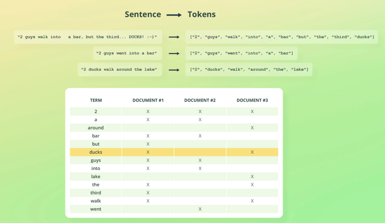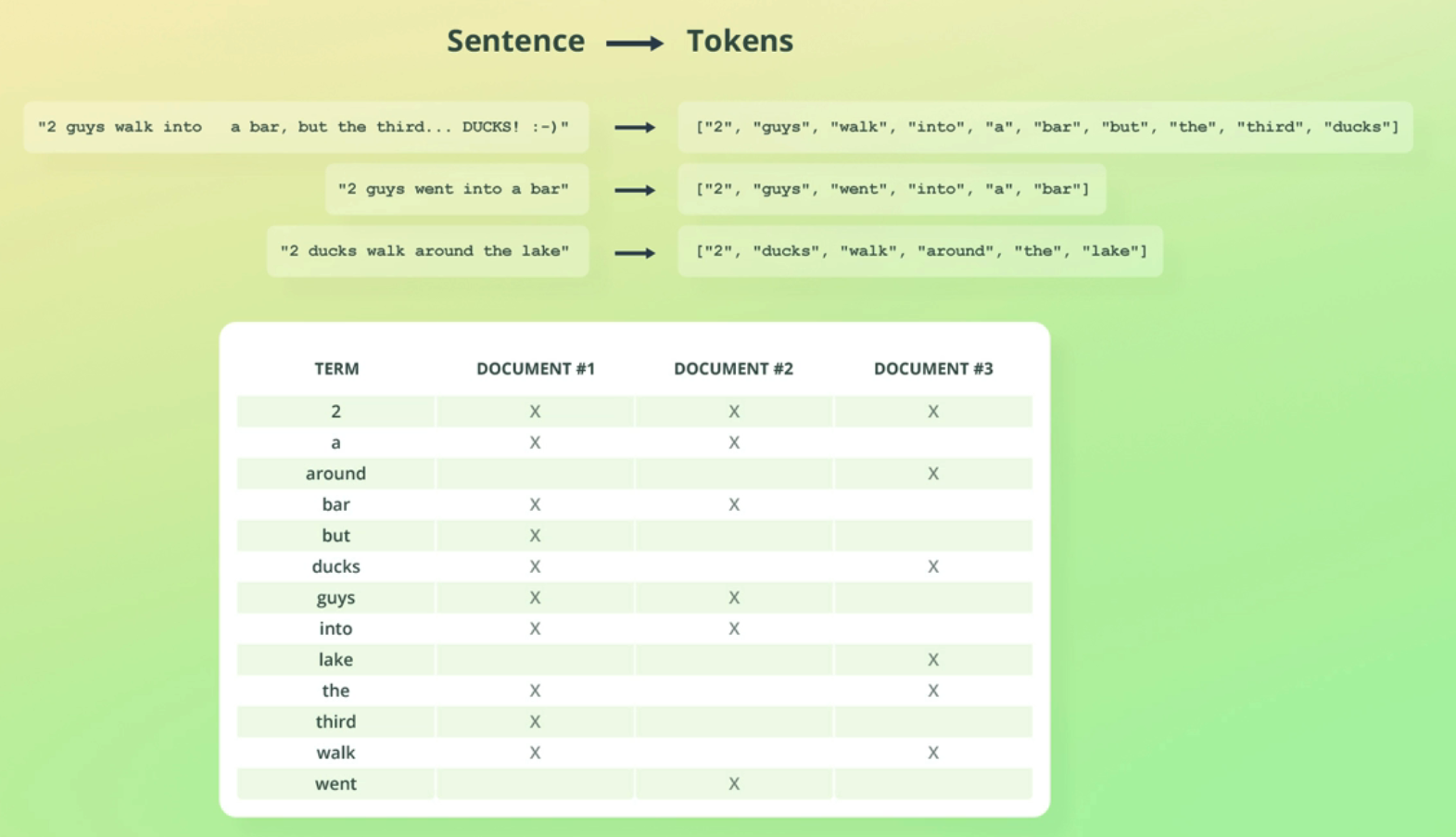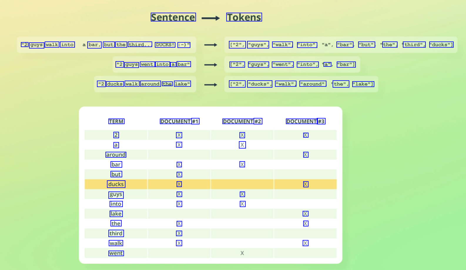 Sentence Tokens "2 guys walk into bar, but the third.. DUCKS! :-)" ["2", "guys", "walk", "into", a a" "bar", "but", the" third", "ducks"] "2 guys went into a bar" ["2", "guys" "went", "into", "a" "bar"] "2 ducks walk around the lake" ["2", "ducks", "walk", "around", "the", "lake"] TERM 2 a around bar but ducks guys into lake the third walk went DOCUMENT #1 X X DOCUMENT #2 X X DOCUMENT #3 X X X X X X X X X X X X X X X X X X
