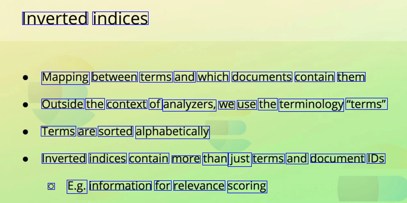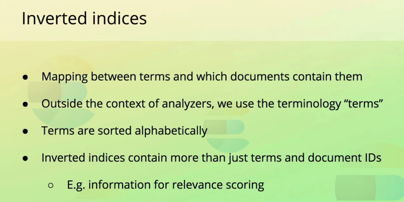 Inverted indices Mapping between terms and which documents contain them Outside the context of analyzers, we use the terminology "terms" Terms are sorted alphabetically Inverted indices contain more than just terms and document IDs O E.g. information for relevance scoring