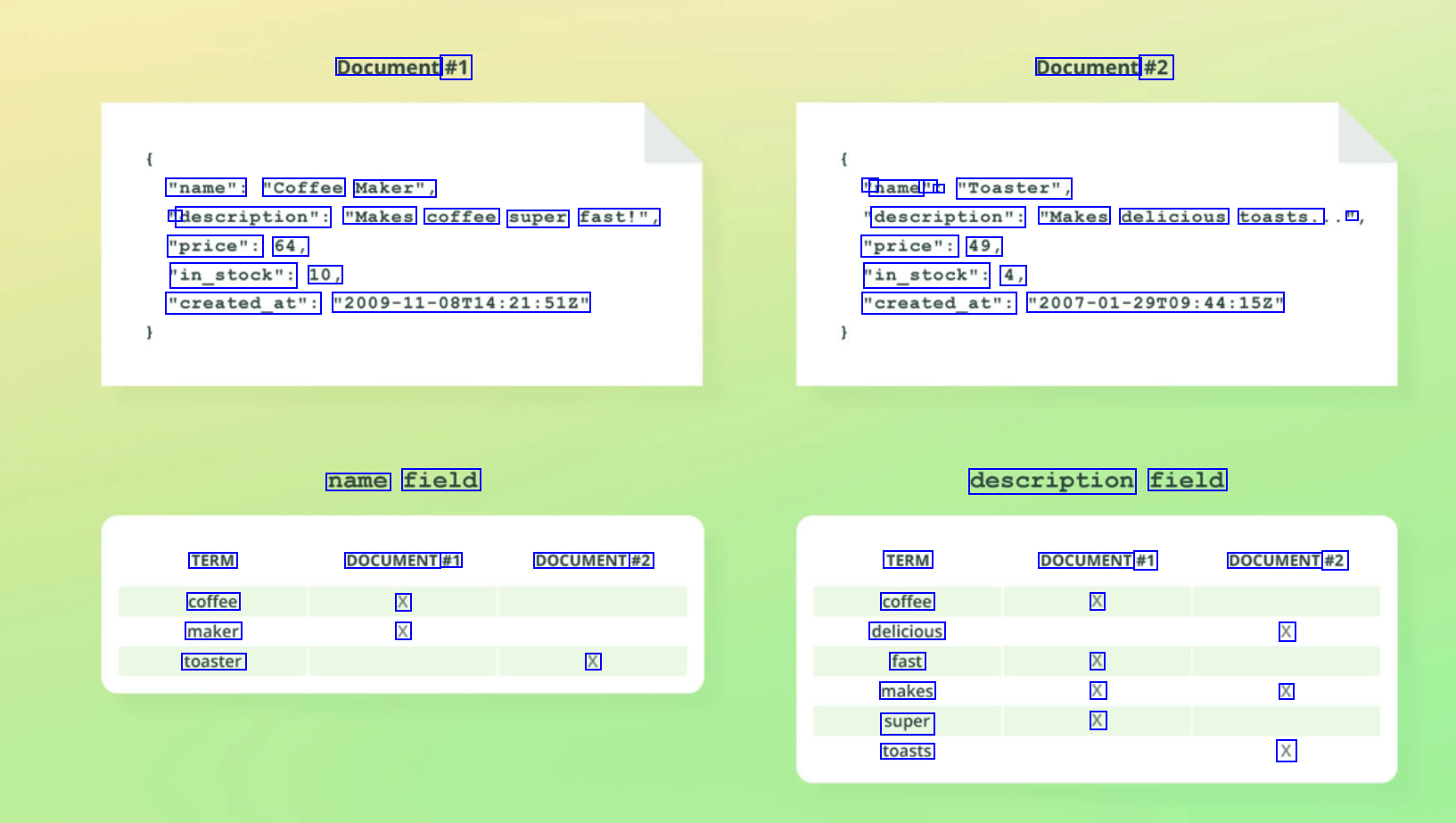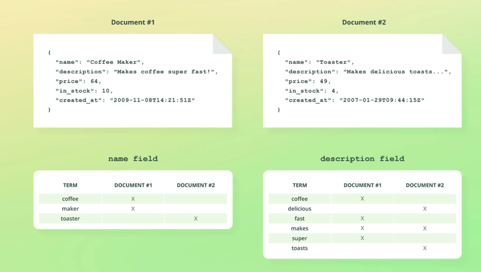 Document #1 Document #2 "name": "Coffee Maker", " name " : "Toaster", " description": "Makes coffee super fast!", description": "Makes delicious toasts. II "price": 64, "in_stock": 10, "price": 49, "in_stock": 4, "created_at": "2009-11-08714:21:512" "created_at": "2007-01-29T09:44:152" name field description field TERM coffee maker toaster DOCUMENT #1 X X DOCUMENT #2 TERM coffee delicious fast makes super toasts DOCUMENT #1 X DOCUMENT #2 X X X X X X X
