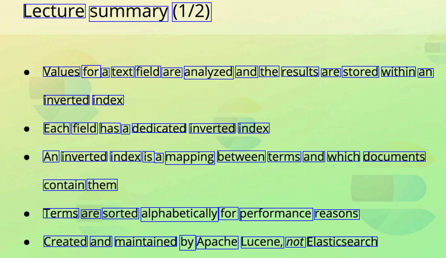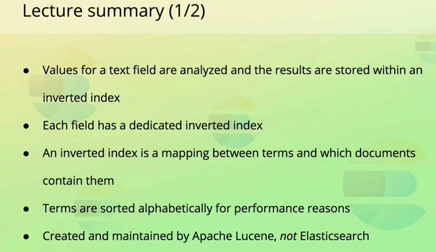 Lecture summary (1/2) Values for a text field are analyzed and the results are stored within an inverted index Each field has a dedicated inverted index An inverted index is a mapping between terms and which documents contain them Terms are sorted alphabetically for performance reasons Created and maintained by Apache Lucene, not Elasticsearch
