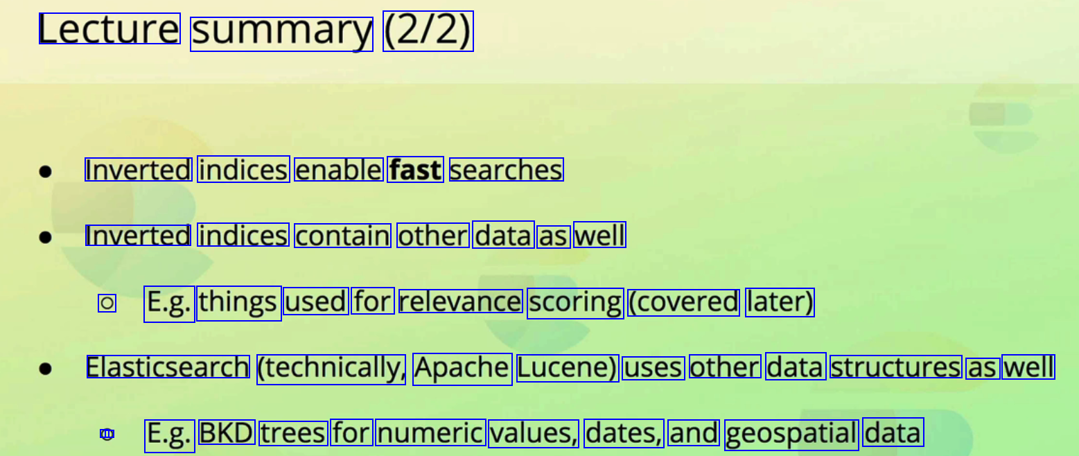 Lecture summary (2/2) Inverted indices enable fast searches Inverted indices contain other data as well O E.g. things used for relevance scoring (covered later) Elasticsearch (technically, Apache Lucene) uses other data structures as well C - E.g. BKD trees for numeric values, dates, and geospatial data