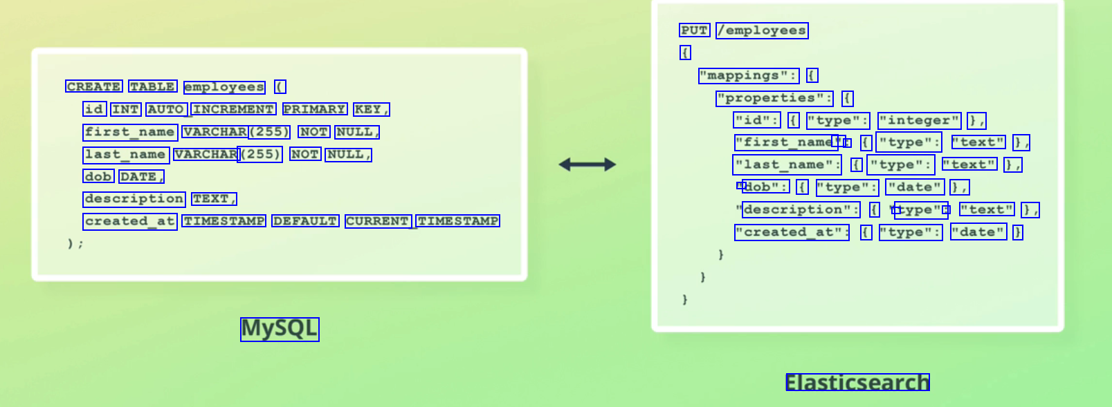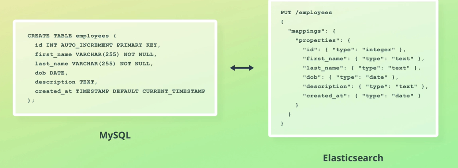PUT /employees ( "mappings": ( CREATE TABLE employees ( "properties": ( id INT AUTO INCREMENT PRIMARY KEY, first_name VARCHAR (255) NOT NULL, last_name VARCHAR (255) NOT NULL, "id": ( "type": "integer" ), "first_name' " : ( "type": "text" 1, "last_name": f "type": "text" 1, - dob": ( "type": "date" 1, dob DATE, description TEXT, description": ( 1 type": : "text" 1, "created_at": ( "type": "date" ) created_at TIMESTAMP DEFAULT CURRENT TIMESTAMP MySQL Elasticsearch