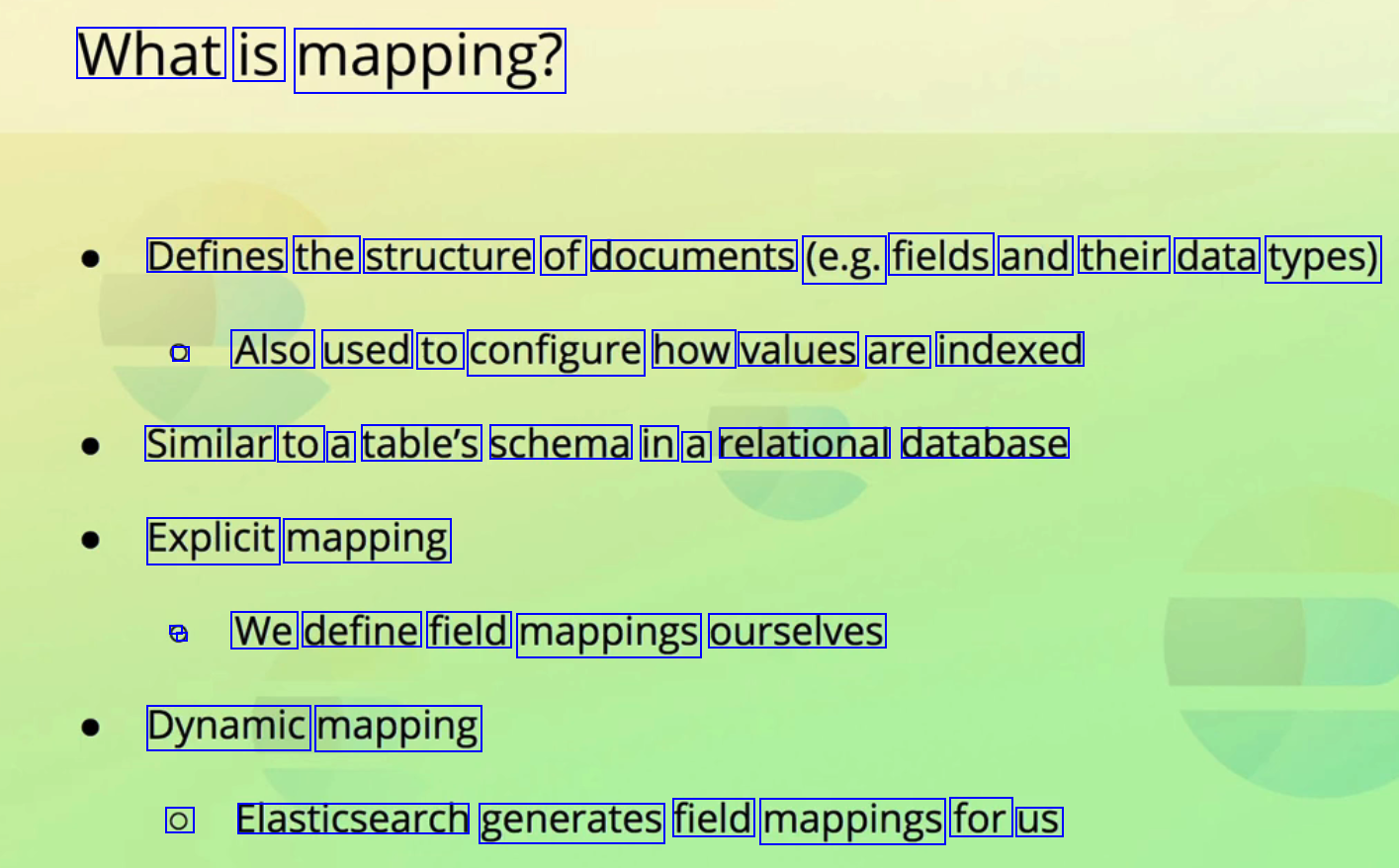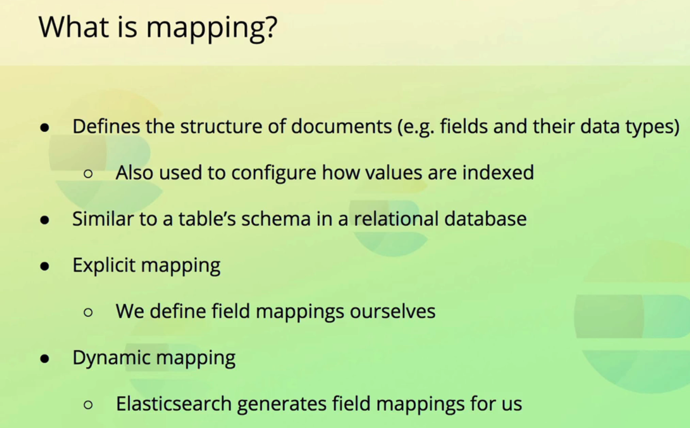 What is mapping? Defines the structure of documents (e.g. fields and their data types) ) Also used to configure how values are indexed Similar to a table's schema in a relational database Explicit mapping . We define field mappings ourselves Dynamic mapping O Elasticsearch generates field mappings for us