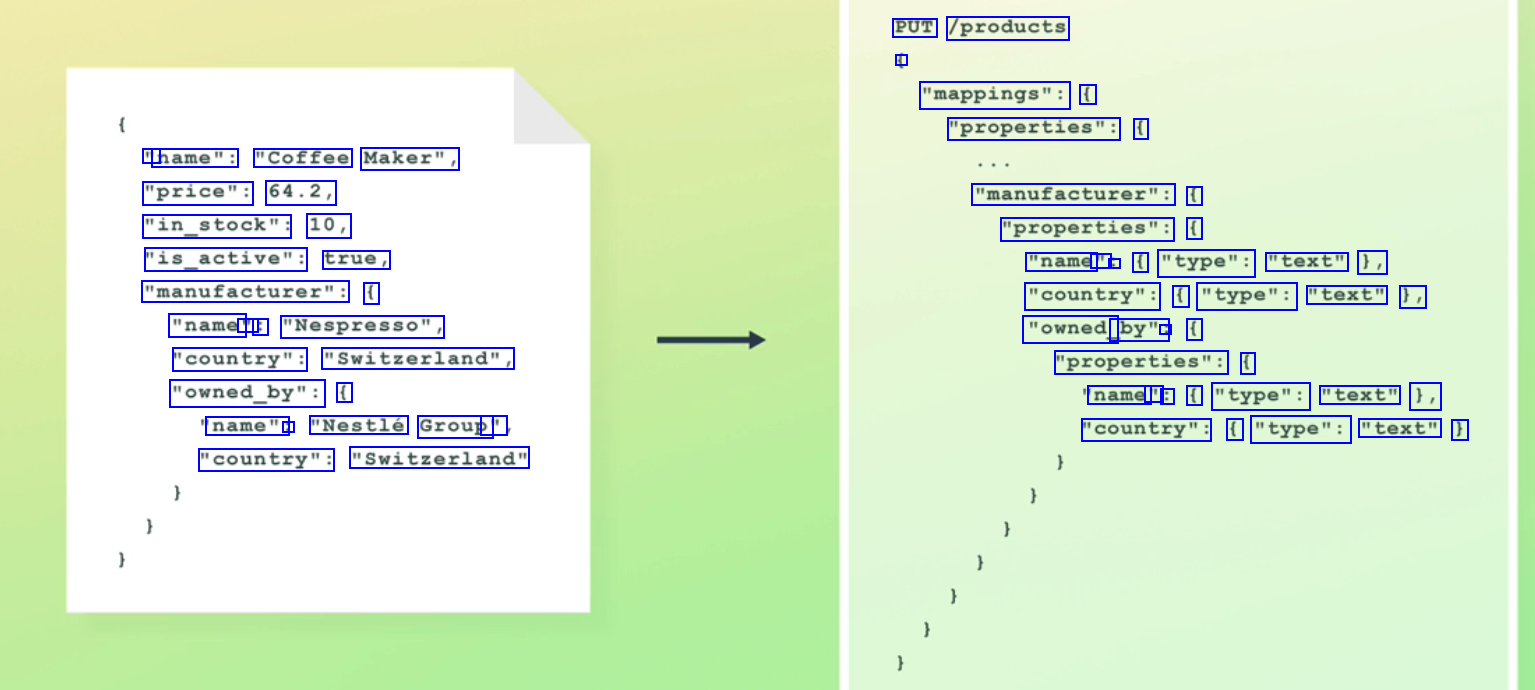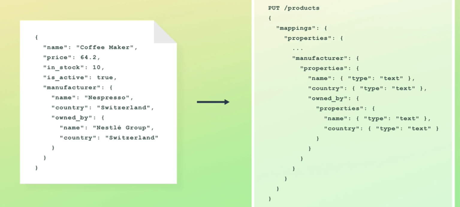 PUT /products - "mappings": ( "properties": ( " name": "Coffee Maker", "price": 64.2, "in_stock": 10, "is_active": true, "manufacturer": ( "name' " : "Nespresso", "country": "Switzerland", "owned_by": ( "manufacturer": ( "properties": ( "name - : ( "type": "text" 1, "country": ( "type": "text" 1, "owned_ by": : ( "properties": ( name " : ( "type": "text" 1, "country": ( "type": "text" ) name": : "Nestlé Group' " "country": "Switzerland"