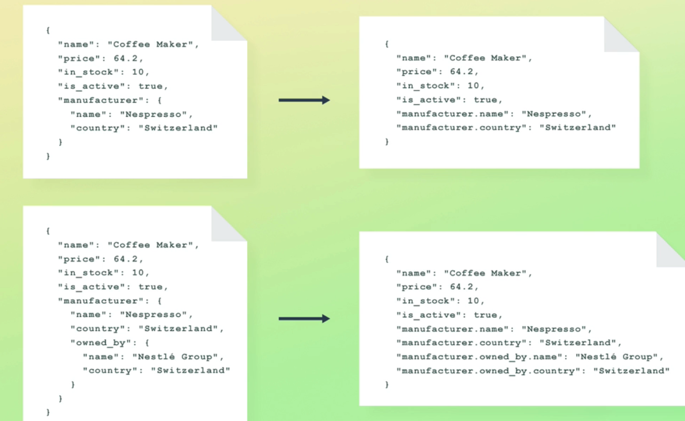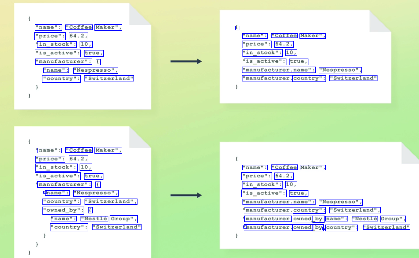 "name": "Coffee Maker", "price": 64.2, in_stock": 10, "is_active": true, "manufacturer": ( "name": "Nespresso", "country": "Switzerland" 1 "name": "Coffee Maker", "price": 64.2, "in_stock": 10, is_active": true, "manufacturer.name": "Nespresso", "manufacturer. country": "Switzerland" name": "Coffee Maker", "price": 64.2, "in_stock": 10, "is_active": true, manufacturer": ( l name": "Nespresso", "country": "Switzerland", "owned_by": ( "name": "Coffee Maker", "price": 64.2, "in_stock": 10, "is_active": true, "manufacturer.name": "Nespresso", manufacturer. country": "Switzerland", manufacturer. owned by name": "Nestlé Group", 1 manufacturer. owned by : country": "Switzerland" "name": "Nestlé Group", "country": "Switzerland"