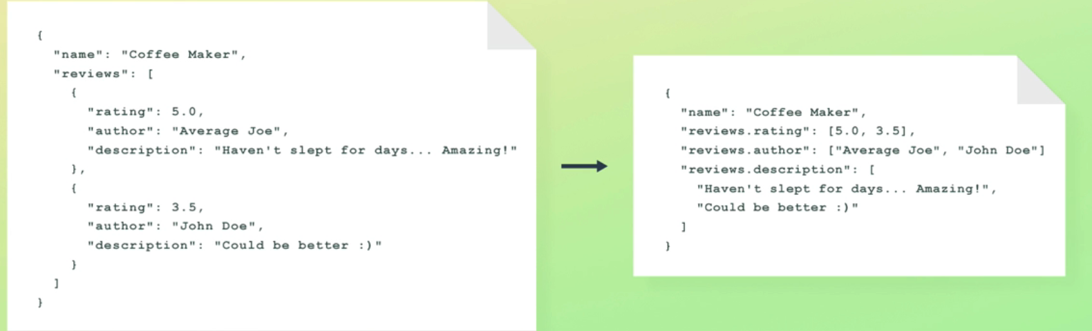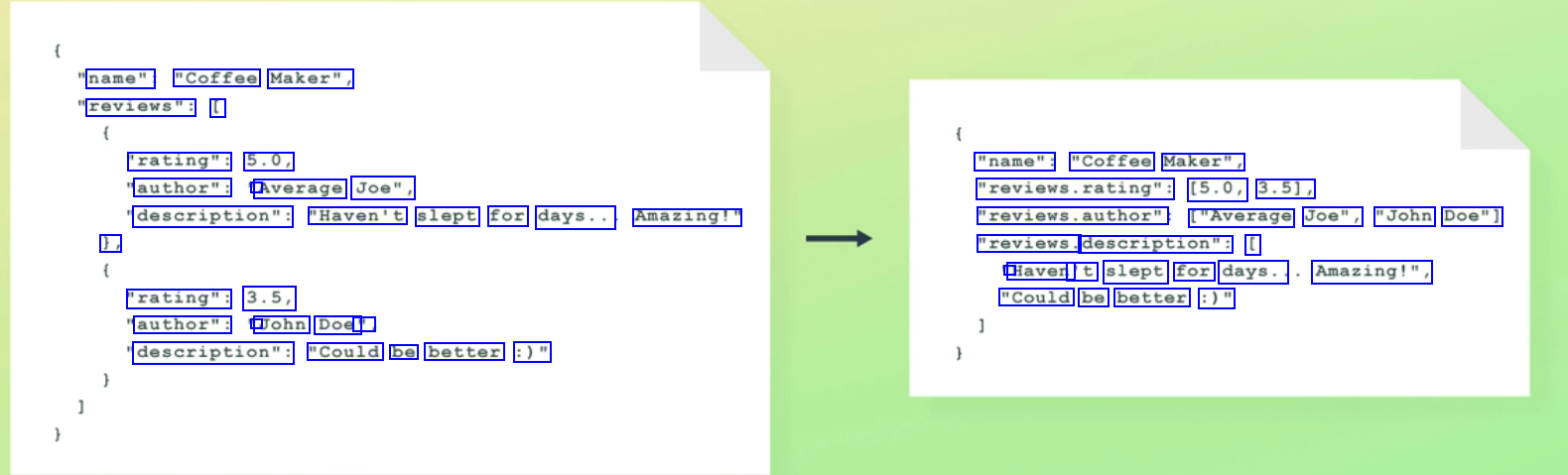 name": "Coffee Maker", reviews": [ 'rating": 5.0, "name": "Coffee Maker", author": ' Average Joe", "reviews.rating": (5.0, 3.51, description": "Haven't slept for days.. Amazing!" reviews.author" ["Average Joe", "John Doe"] ), "reviews. description": [ ' Haven 't slept for days.. Amazing!", "rating": 3.5, "Could be better :)" author": ' John Doe' : description": "Could be better :)"