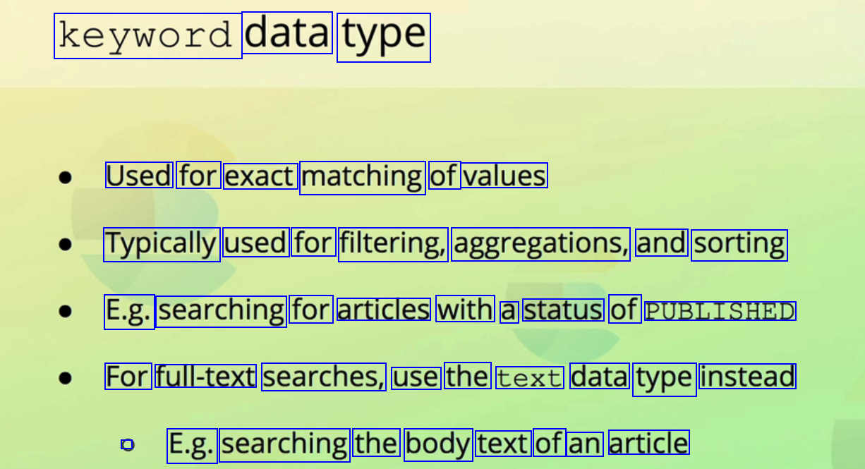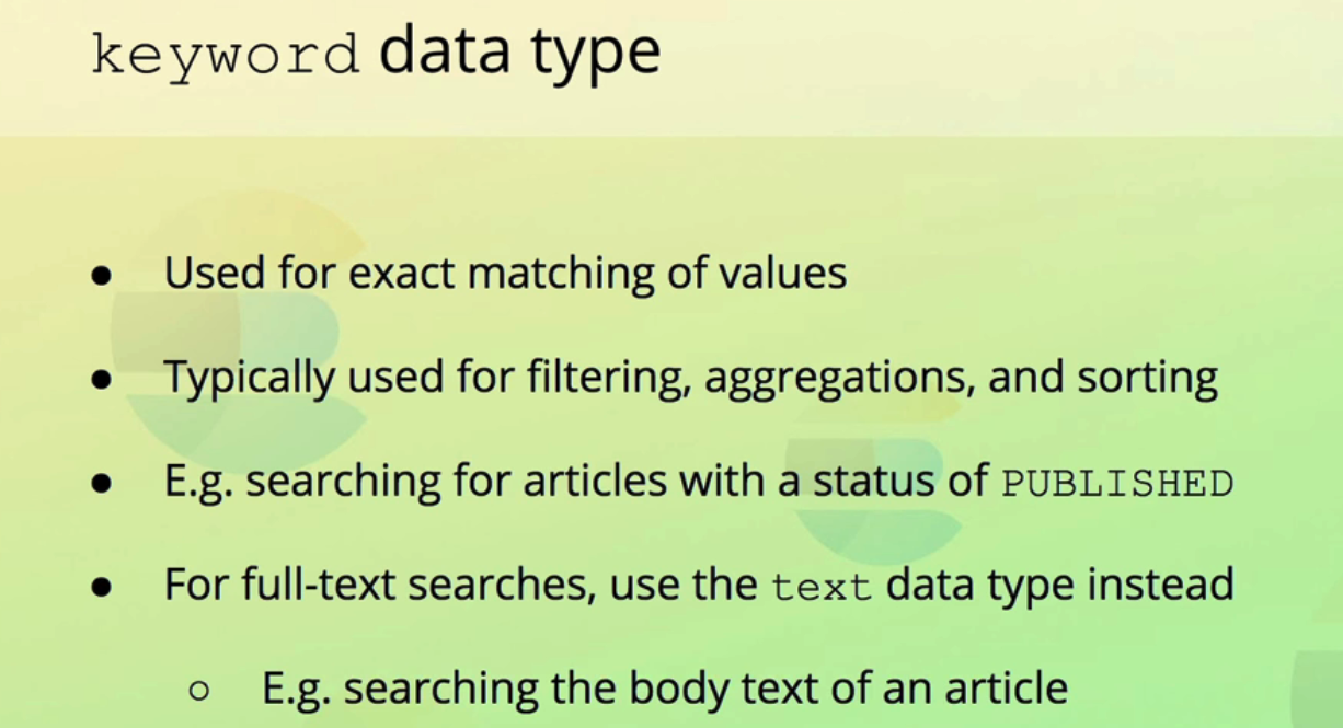 keyword data type Used for exact matching of values Typically used for filtering, aggregations, and sorting E.g. searching for articles with a status of PUBLISHED For full-text searches, use the text data type instead C E.g. searching the body text of an article