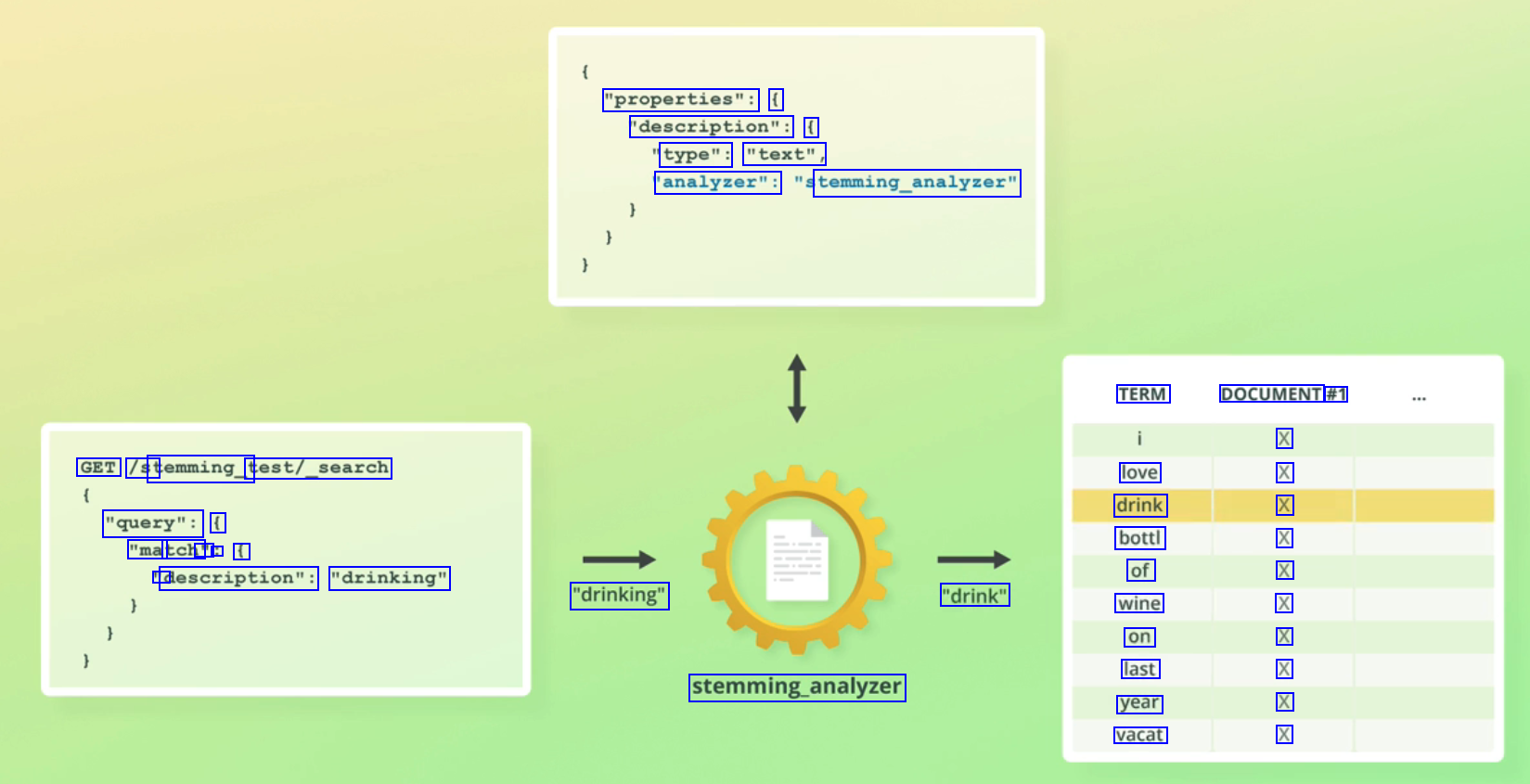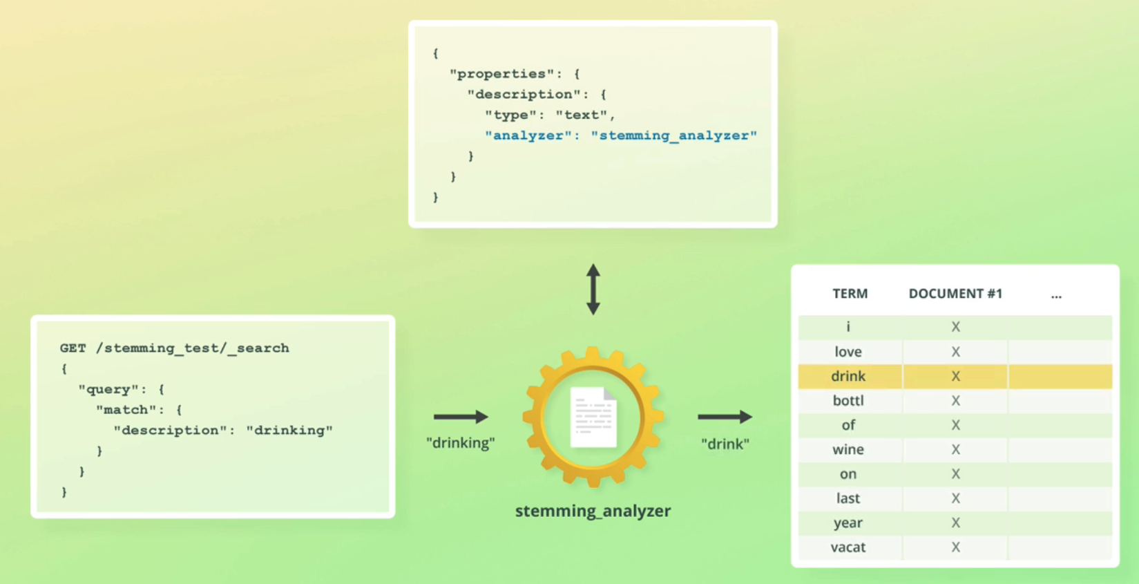 "properties": ( 'description": ( type": "text", 'analyzer": temming_analyzer" TERM DOCUMENT #1 X X X X X X X X X X GET /st temming_t test/_search love drink bottl of wine on last year vacat "query": ( "ma tch' " : f D description": "drinking" "drinking" "drink" stemming.analyzer
