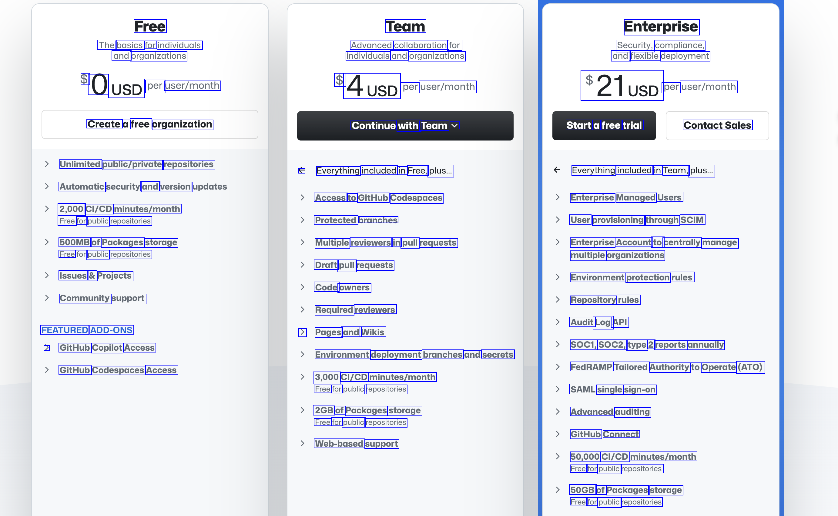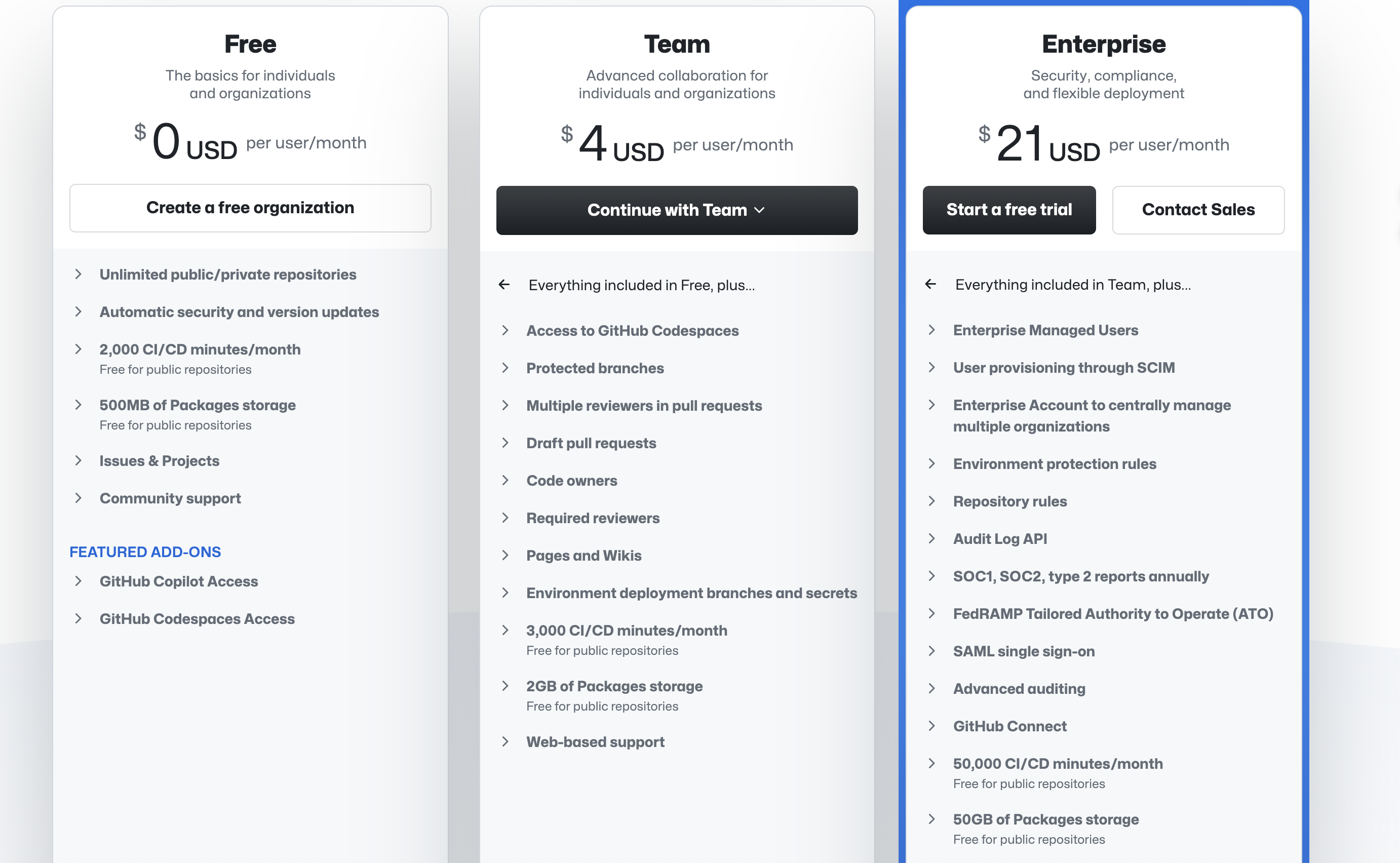 Free The basics for individuals and organizations 0 USD per user/month Team Advanced collaboration for individuals and organizations 4USD per user/month Enterprise Security, compliance, and flexible deployment $21UsD per user/month $ $ Create a free organization Continue with Team V Start a free trial Contact Sales Unlimited public/private repositories Automatic security and version updates 2,000 CI/CD minutes/month Free for public repositories 500MB of Packages storage Free for public repositories Issues & Projects Community support FEATURED ADD-ONS > GitHub Copilot Access GitHub Codespaces Access € Everything included in Free, plus... Access to GitHub Codespaces Protected branches Multiple reviewers in pull requests Draft pull requests Code owners Required reviewers > Pages and Wikis Everything included in Team, plus... Enterprise Managed Users User provisioning through SCIM Enterprise Account to centrally manage multiple organizations Environment protection rules Repository rules Audit Log API SOC1, SOC2, type 2 reports annually FedRAMP Tailored Authority to Operate (ATO) Environment deployment branches and secrets 3,000 CI/CD minutes/month Free for public repositories 2GB of Packages storage Free for public repositories Web-based support SAML single sign-on Advanced auditing GitHub Connect 50,000 CI/CD minutes/month Free for public repositories 50GB of Packages storage Free for public repositories