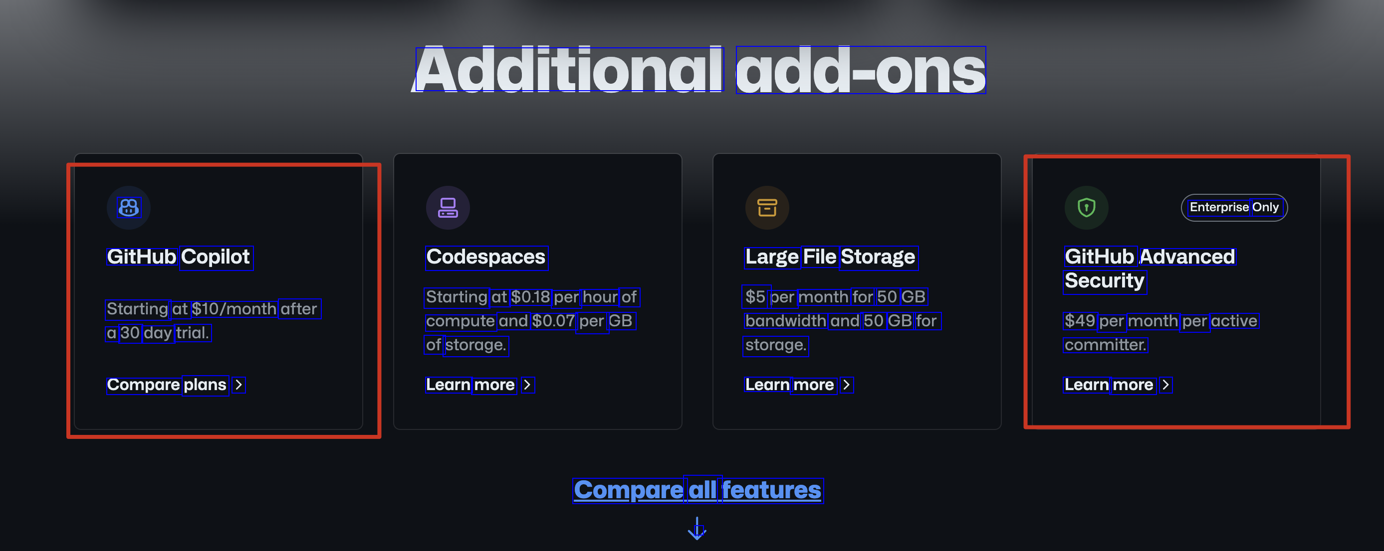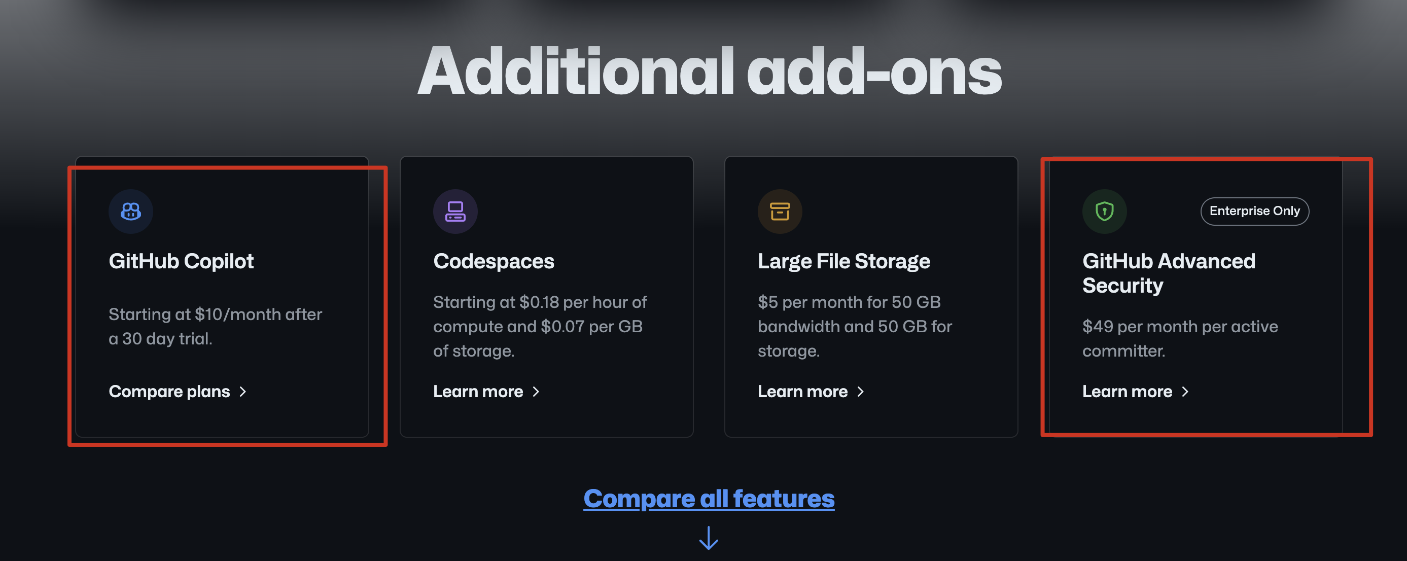 Additional add-ons 88 Enterprise Only GitHub Copilot Codespaces Large File Storage GitHub Advanced Security Starting at $0.18 per hour of compute and $0.07 per GB of storage. $5 per month for 50 GB bandwidth and 50 GB for storage. Starting at $10/month after a 30 day trial. $49 per month per active committer. Compare plans > Learn more > Learn more > Learn more > Compare all features I