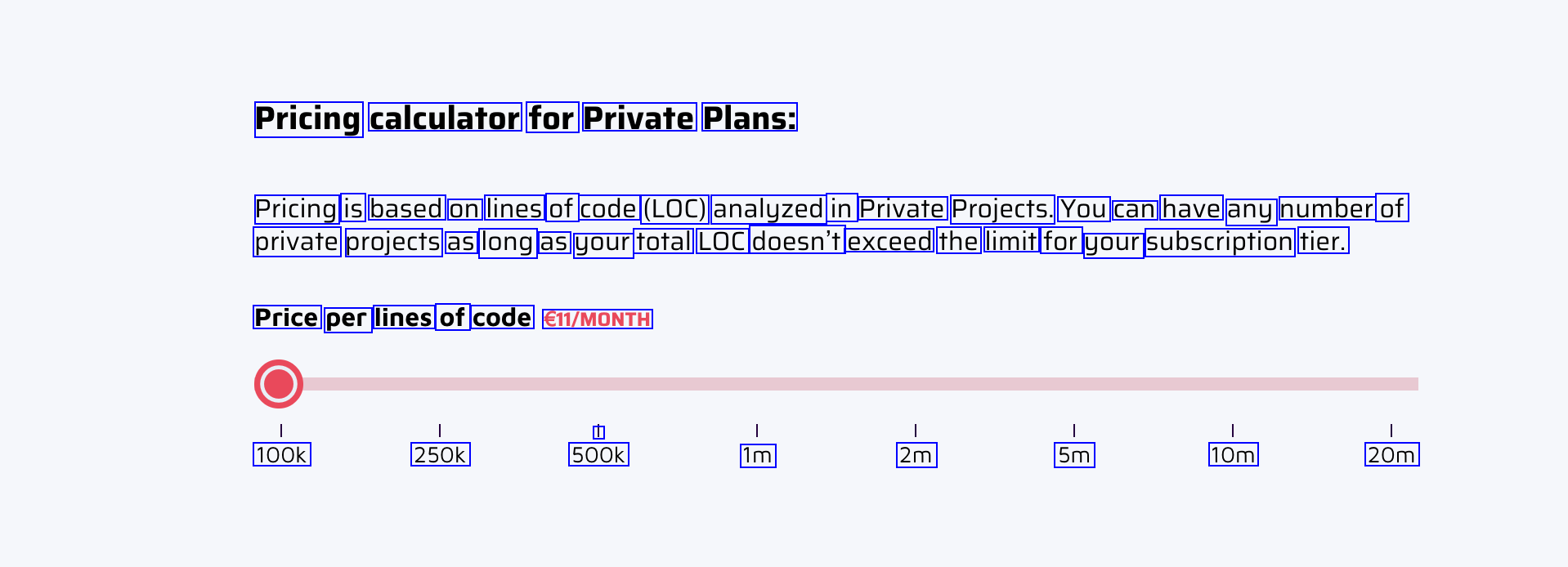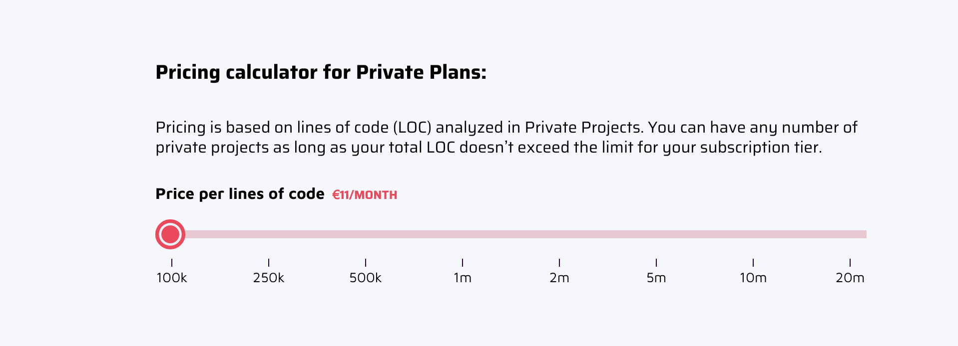 Pricing calculator for Private Plans: Pricing is based on lines of code (LOC) analyzed in Private Projects. You can have any number of private projects as long as your total LOC doesn't exceed the limit for your subscription tier. Price per lines of code €11/MONTH I 500k 100k 250k 1m 2m 5m 10m 20m