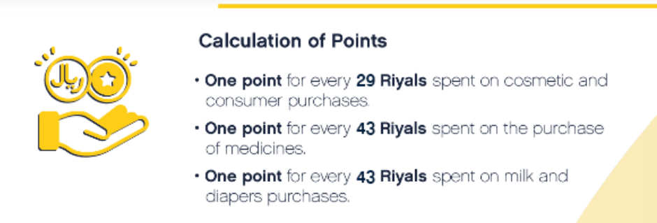 29 SAR = 1 point # cosmetics and consumer 43 SAR= 1 point # medicnes and others 1 Arbahi = 2 Qitaf points