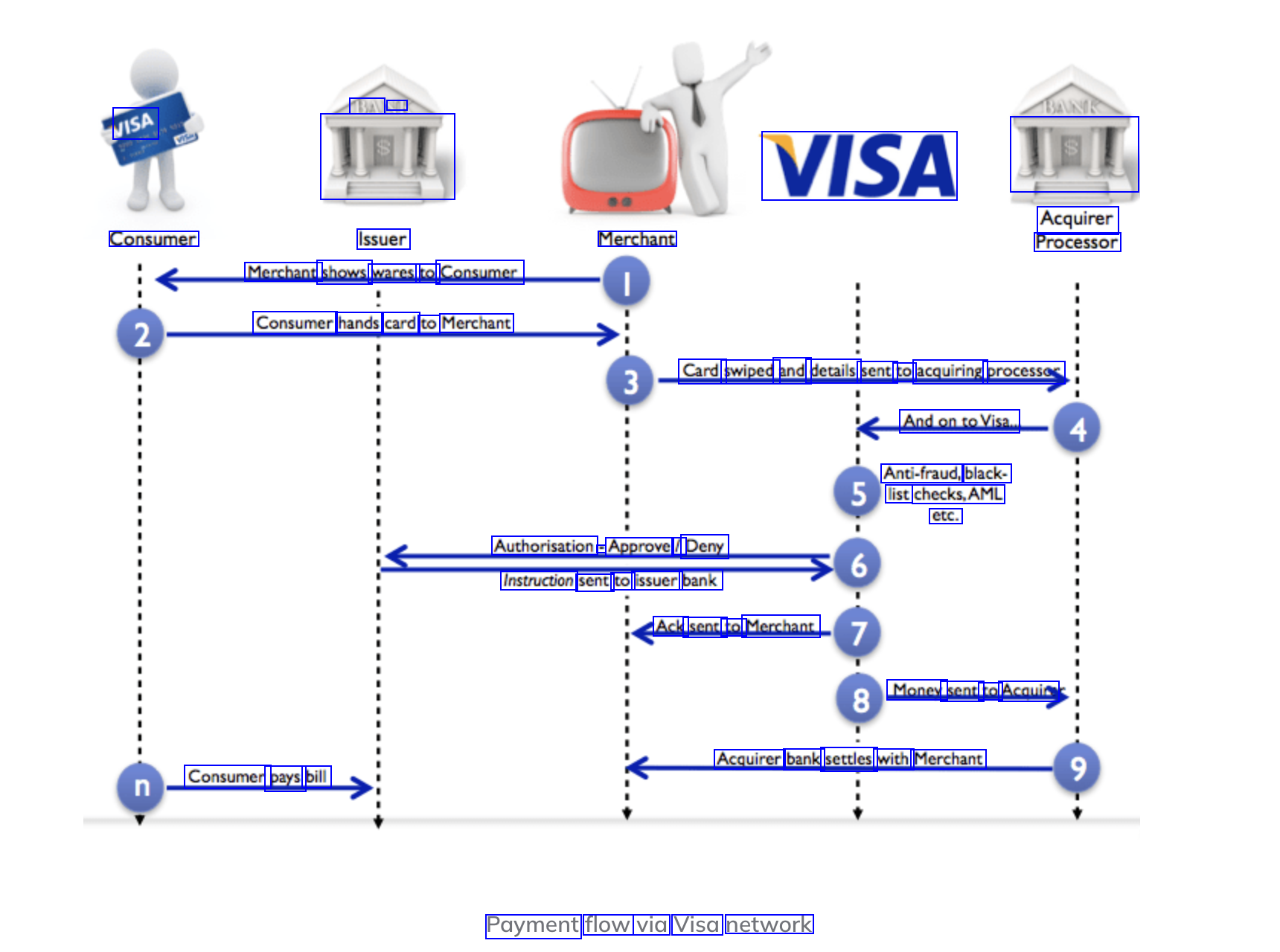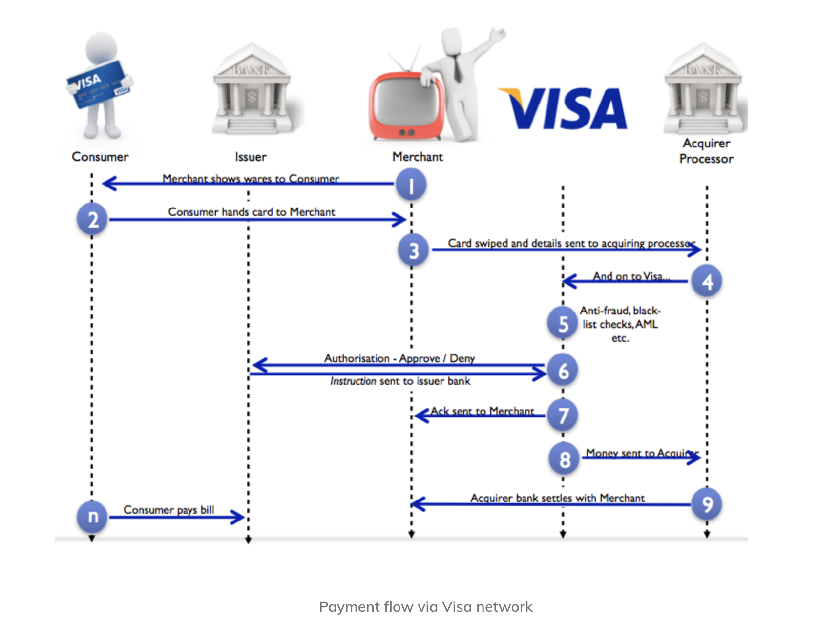 BAU E TAT VISA INT VISA Acquirer Processor Consumer Issuer Merchant Merchant shows wares to Consumer Consumer hands card to Merchant Card swiped and details sent to acquiring processos And.on.toVisa. Anti-fraud, black- list checks,AML etc. Authorisation - Approve / Deny Instruction sent to issuer bank Ack sent to Merchant Money sent to Acauia Acquirer bank settles with Merchant Consumer pays bill Payment flow via Visa network