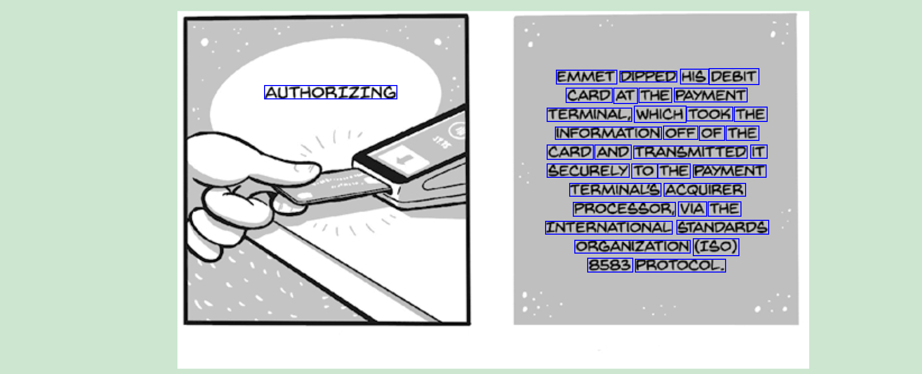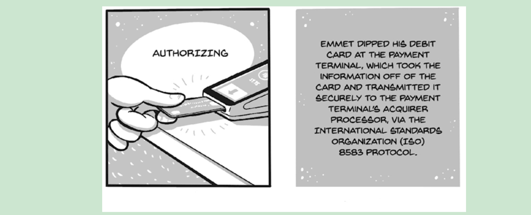 EMMET DIPPED HIS DEBIT CARD AT THE PAYMENT TERMINAL, WHICH TOOK THE INFORMATION OFF OF THE CARD AND TRANSMITTED IT SECURELY TO THE PAYMENT TERMINAL'S ACQUIRER PROCESSOR, VIA THE INTERNATIONAL STANDARDS ORGANIZATION (ISO) 8583 PROTOCOL. AUTHORIZING