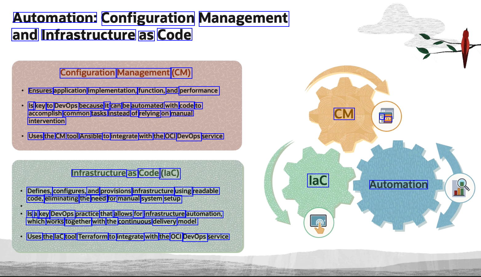 Automation: Configuration Management and Infrastructure as Code Configuration Management (CM) Ensures application implementation, function, and performance Is key to DevOps because it can be automated with code to accomplish common tasks instead of relying on manual CM E </> intervention Uses the CM tool Ansible to integrate with the OCI DevOps service Infrastructure as Code (laC) lac Automation Defines, configures, and provisions infrastructure using readable code, eliminating the need for manual system setup Is a key DevOps practice that allows for infrastructure automation, which works together with the continuous delivery model Uses the lac tool Terraform to integrate with the OCI DevOps service