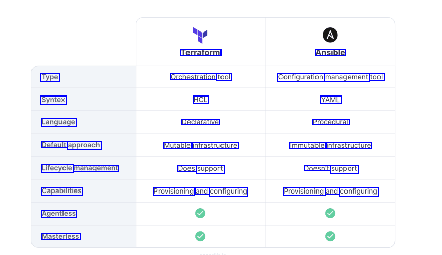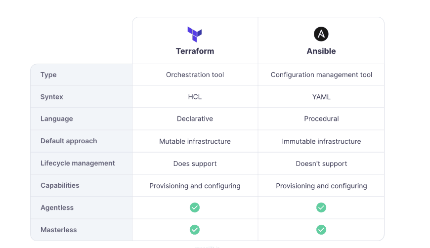 Terraform Ansible Type Orchestration tool Configuration management tool Syntex HCL YAML Language Declarative Procedural Default approach Mutable infrastructure Immutable infrastructure Lifecycle management Does support Doesn't support Capabilities Provisioning and configuring Provisioning and configuring Agentless Masterless