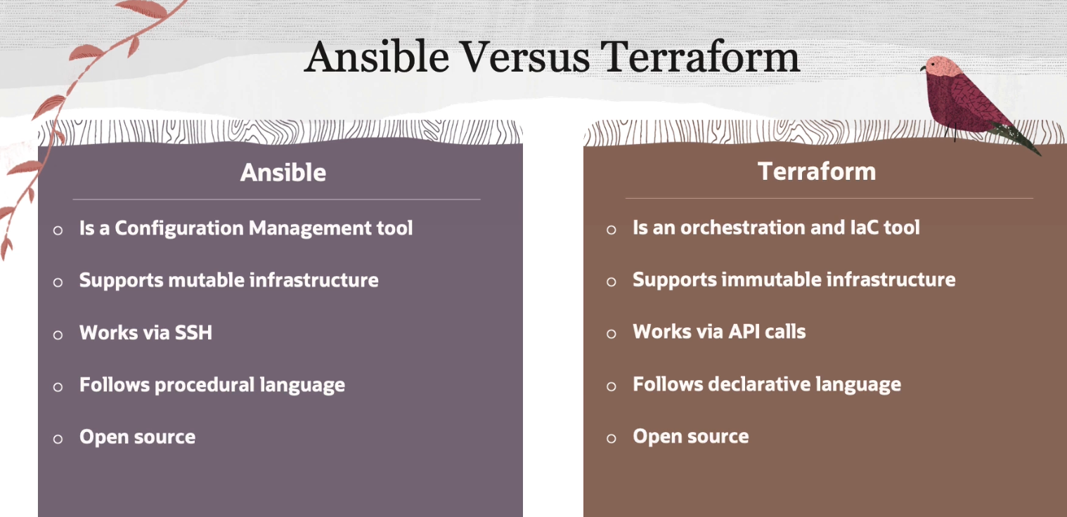 Ansible Versus Terraform Ansible Terraform Is a Configuration Management tool Isan orchestration and lac tool Supports mutable infrastructure Supports immutable infrastructure Works via SSH Works via API calls Follows procedural language Follows declarative language Open source Open source