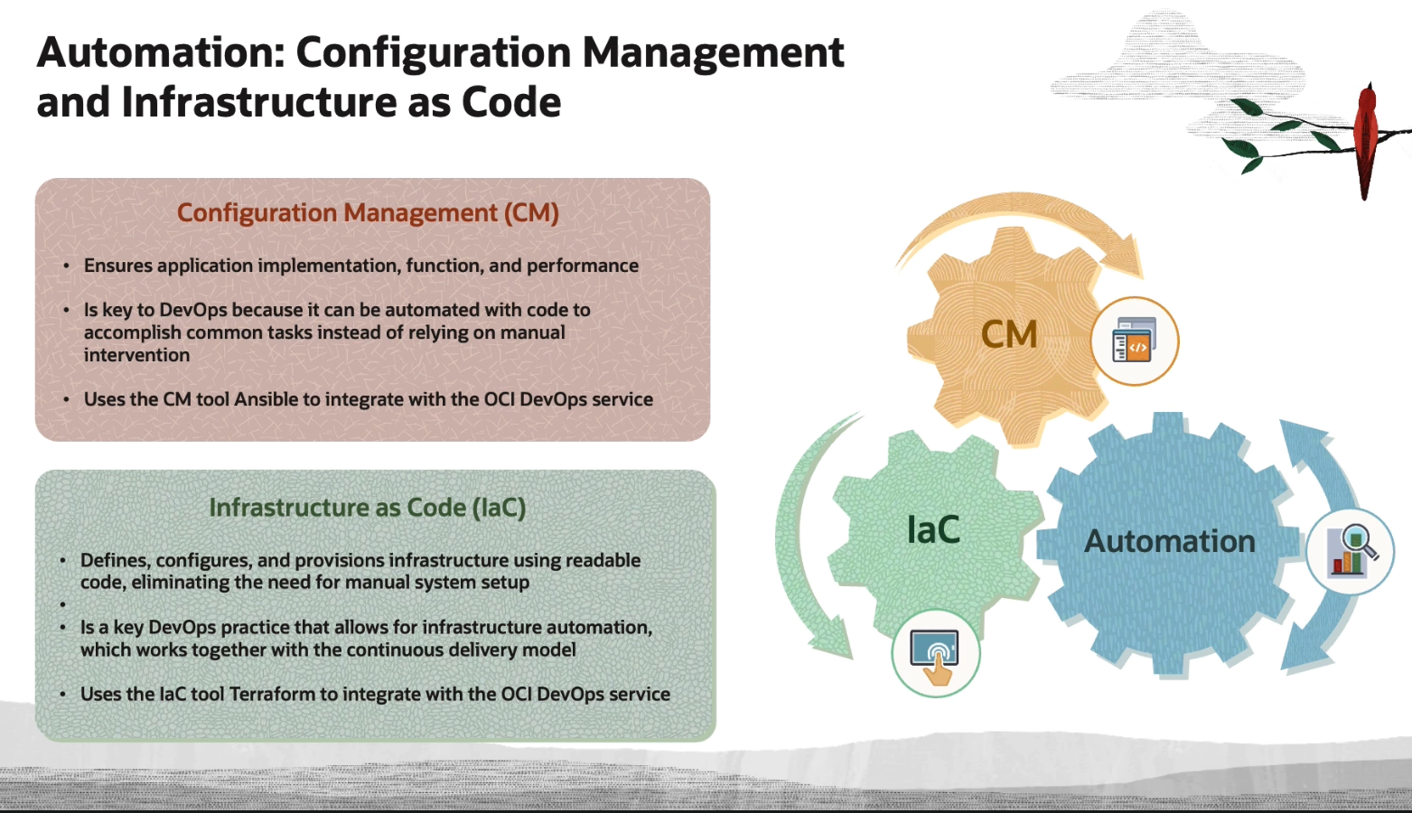 Automation: Configuration Management and Infrastructure as Code Configuration Management (CM) Ensures application implementation, function, and performance Is key to DevOps because it can be automated with code to accomplish common tasks instead of relying on manual CM E </> intervention Uses the CM tool Ansible to integrate with the OCI DevOps service Infrastructure as Code (laC) lac Automation Defines, configures, and provisions infrastructure using readable code, eliminating the need for manual system setup Is a key DevOps practice that allows for infrastructure automation, which works together with the continuous delivery model Uses the lac tool Terraform to integrate with the OCI DevOps service