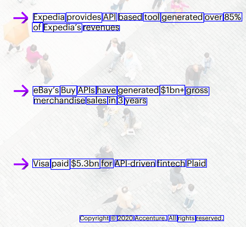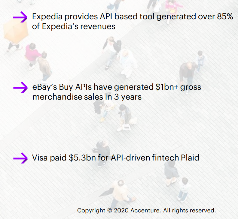 Expedia provides API based tool generated over 85% of Expedia's revenues eBay's Buy APls have generated $1bn+ gross merchandise sales in 3 years Visa paid $5.3bn for APl-driven fintech Plaid Copyright C 2020 Accenture. All rights reserved.