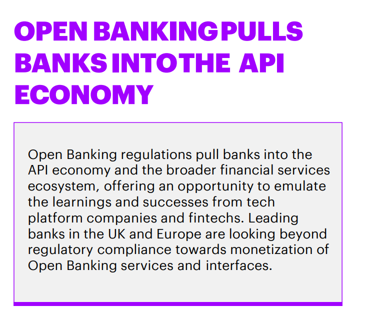 OPENI BANKINGPULLS BANKSINTOTHE API ECONOMY Open Banking regulations pull banks into the API economy and the broader financial services ecosystem, offering an opportunity to emulate the learnings and successes from tech platform companies and fintechs. Leading banks in the UK and Europe are looking beyond regulatory compliance towards monetization of Open Banking services and interfaces.