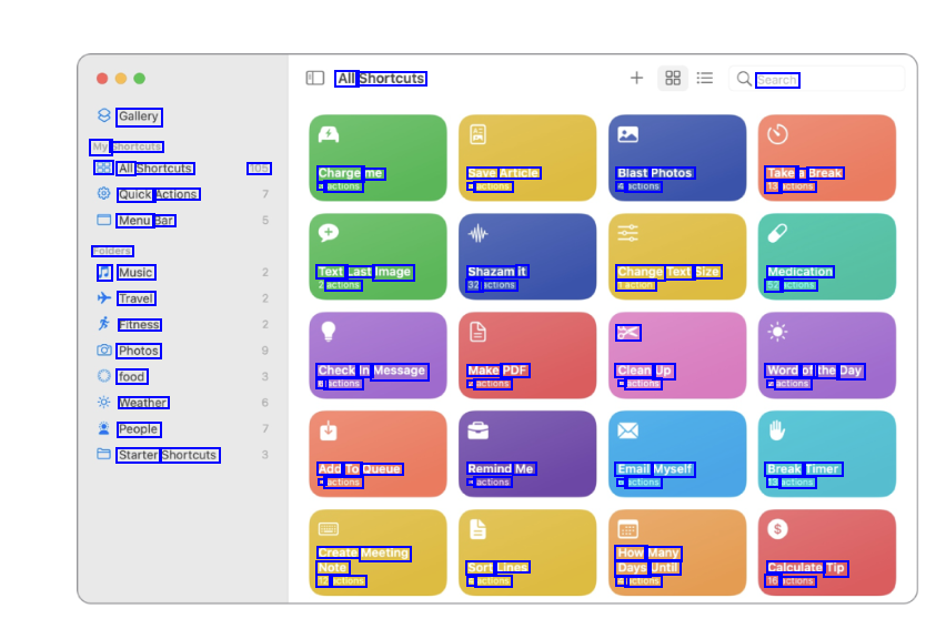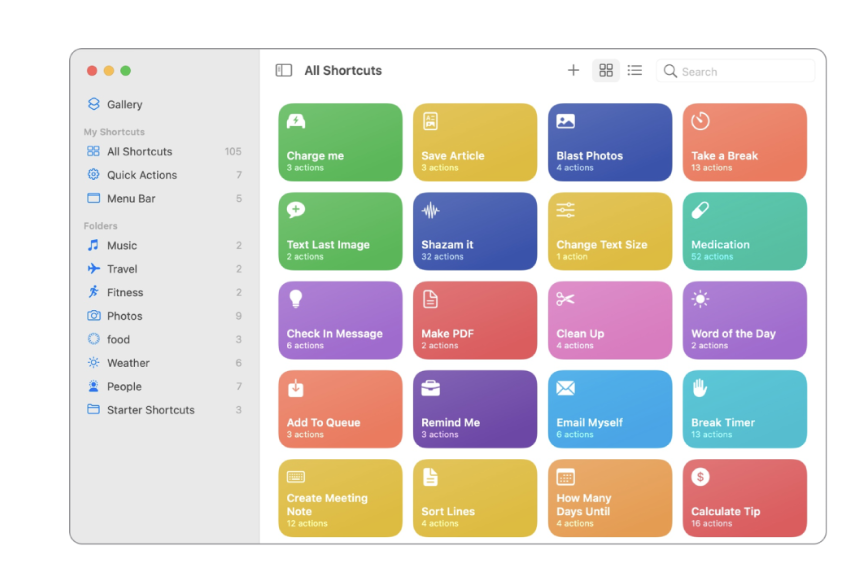 All Shortcuts Search Gallery My Shortcuts 88 All Shortcuts Quick Actions Menu Bar Folders a Music Travel Fitness Photos food Weather People Starter Shortcuts 105 Charge me 3 actions Save Article 3 actions Blast Photos 4 actions Take a Break 13 actions Text Last Image actions Shazam it 32 actions Change Text Size 1action Medication 52 actions X Check In Message 6 actions Make PDF A actions Clean Up 4 actions Word of the Day 2 actions Add To Queue 4 actions Remind Me 3 actions Email Myself 5 actions Break Timer 13 actions Create Meeting Note 12. actions How Many Days Until 4. actions Sort Lines 4 actions Calculate Tip 16 actions