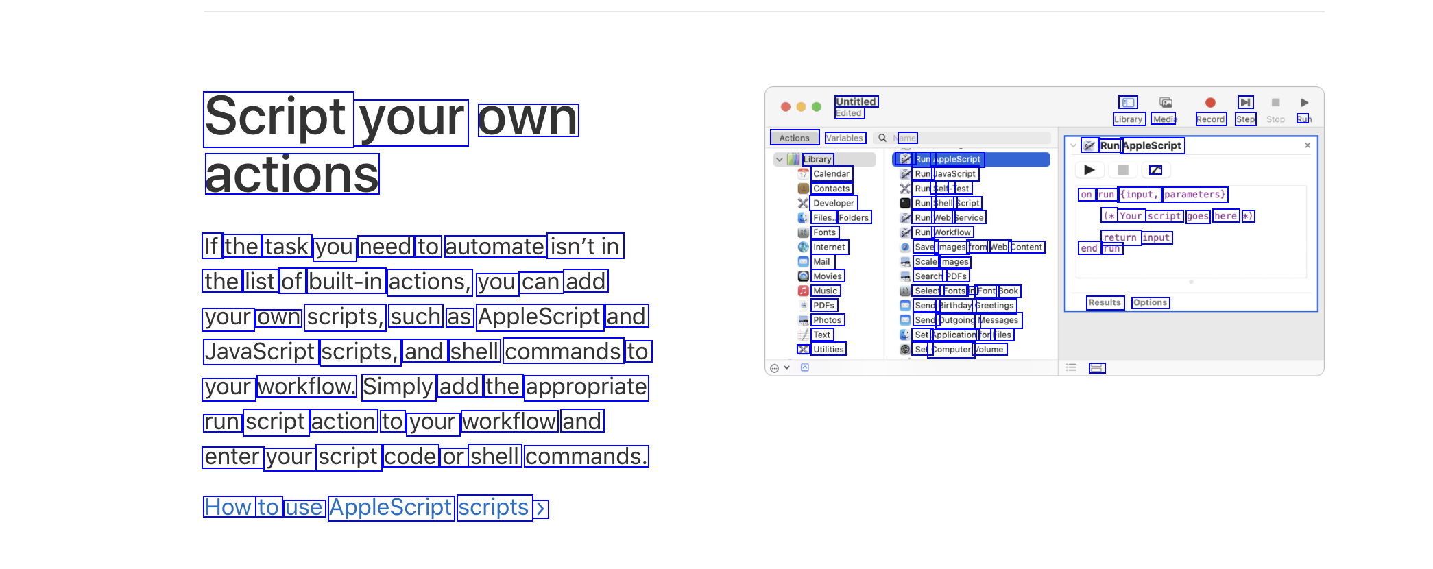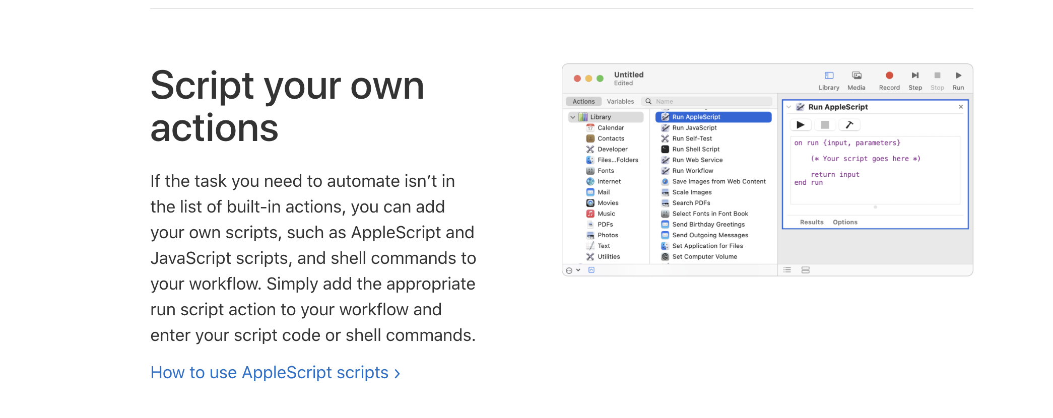 If the task you need to automate isn’t in the list of built-in actions, you can add your own scripts, such as AppleScript and JavaScript scripts, and shell commands to your workflow. Simply add the appropriate run script action to your workflow and enter your script code or shell commands. ref
