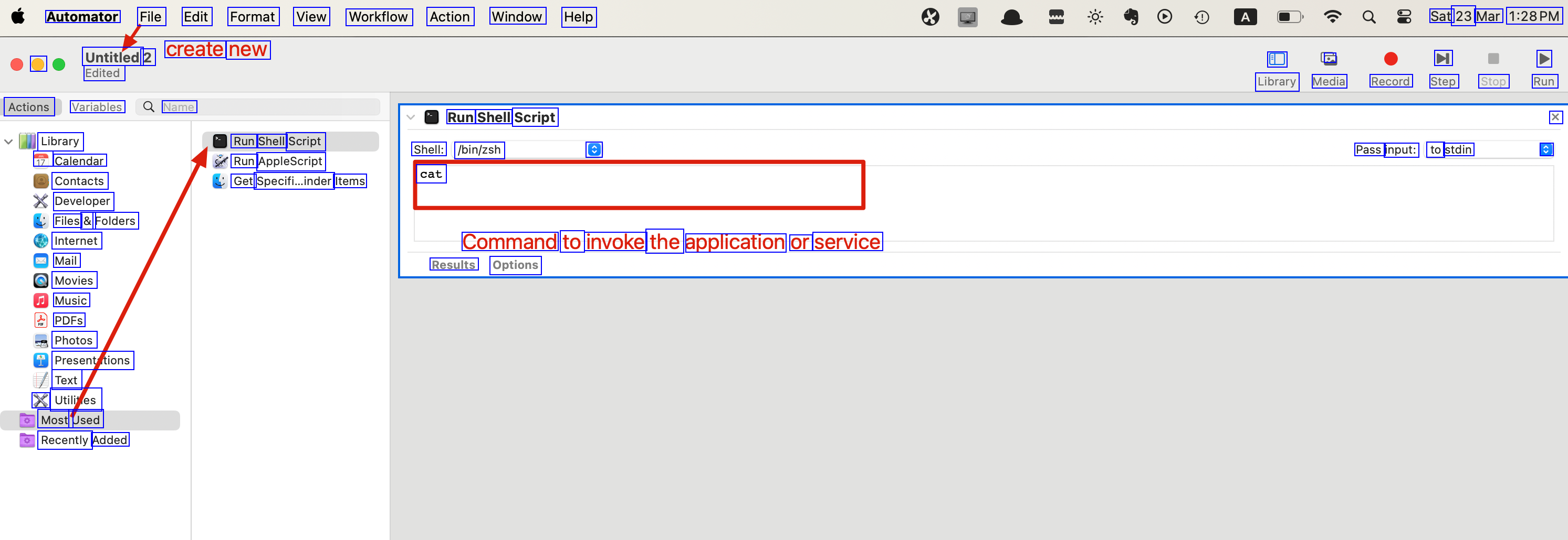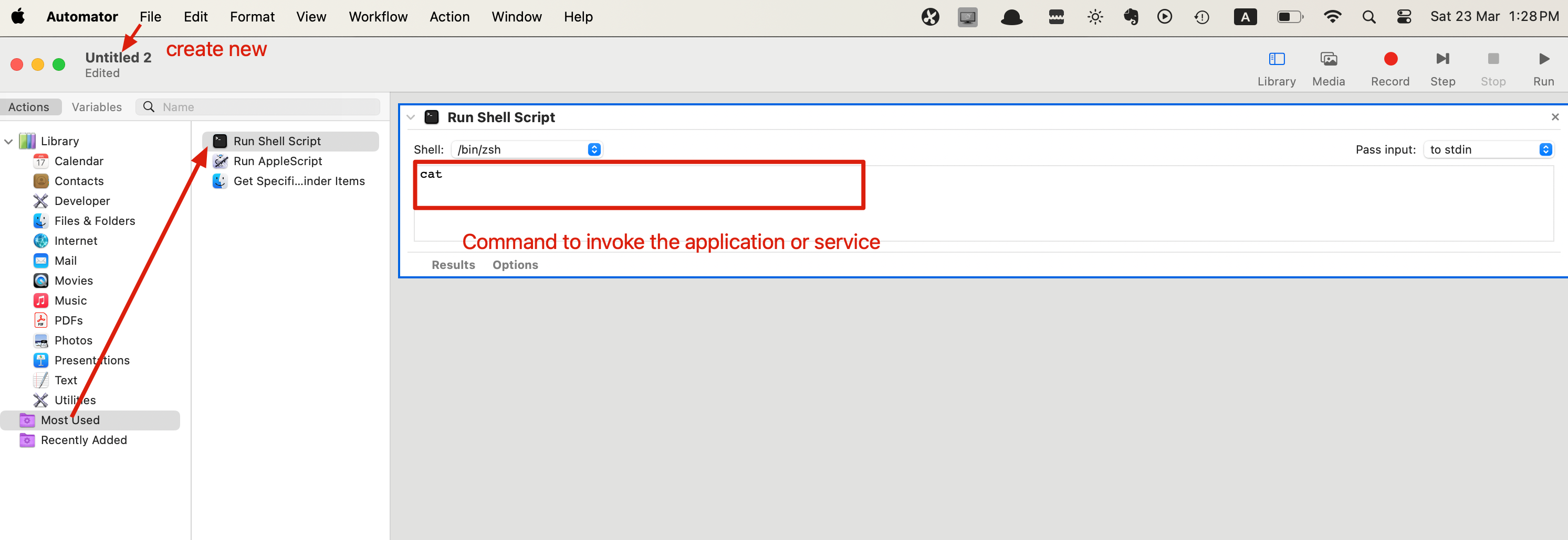 Automator File Edit Format View Workflow Action Window Help Sat 23 Mar 1:28PM Untitled 2 create new O Edited D E M > Library Media Record Step Stop Run Actions Variables Name Run Shell Script Shell: /bin/zsh X C Library 17 Calendar Contacts Developer Files & Folders Internet Mail Movies Music PDFS Photos Presenttions Text X Utilies Most Used Recently Added Run Shell Script Run AppleScript Get Specifi..inder Items cat C Pass input: to stdin Command to invoke the application or service Results Options