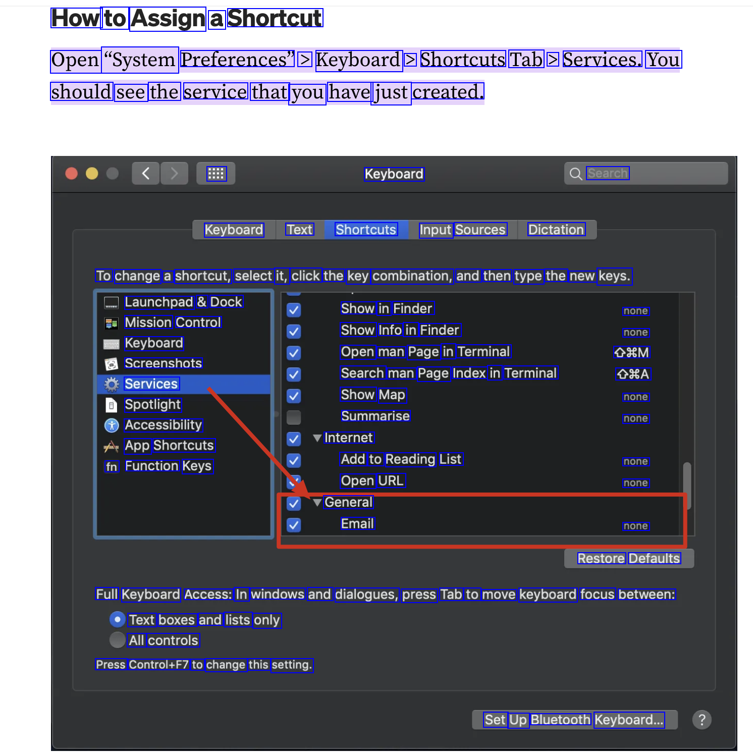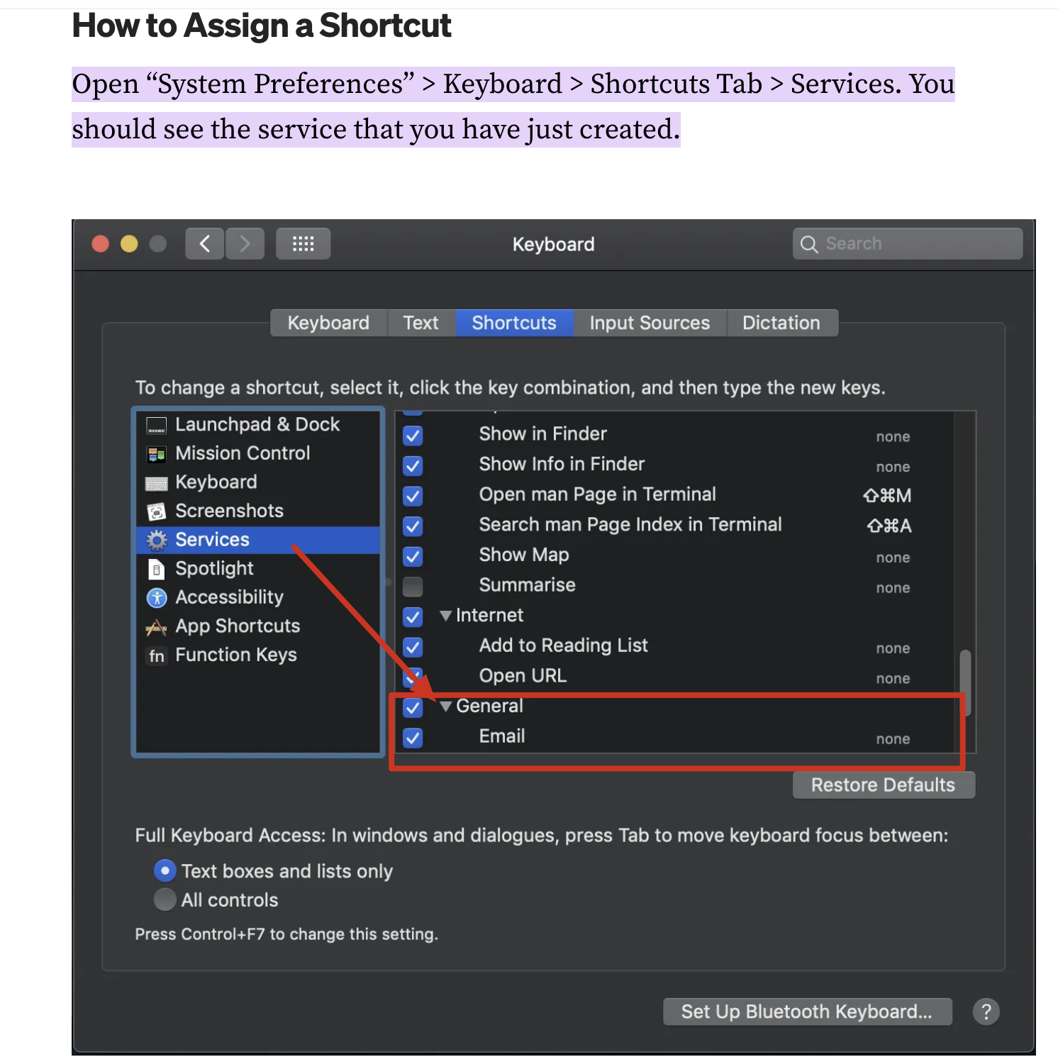 How to Assign a Shortcut Open "System Preferences" > Keyboard > Shortcuts Tab > Services. You should see the service that you have just created. : Keyboard Search Keyboard Text Shortcuts Input Sources Dictation To change a shortcut, select it, click the key combination, and then type the new keys. Launchpad & Dock Mission Control Keyboard Screenshots Services Spotlight Accessibility App Shortcuts fn Function Keys Show in Finder Show Info in Finder Open man Page in Terminal Search man Page Index in Terminal none none 09M O8A none none none none none Restore Defaults Show Map Summarise Internet Add to Reading List Open URL General Email Full Keyboard Access: In windows and dialogues, press Tab to move keyboard focus between: Text boxes and lists only All controls Press Control+F7 to change this setting. Set Up Bluetooth Keyboard...