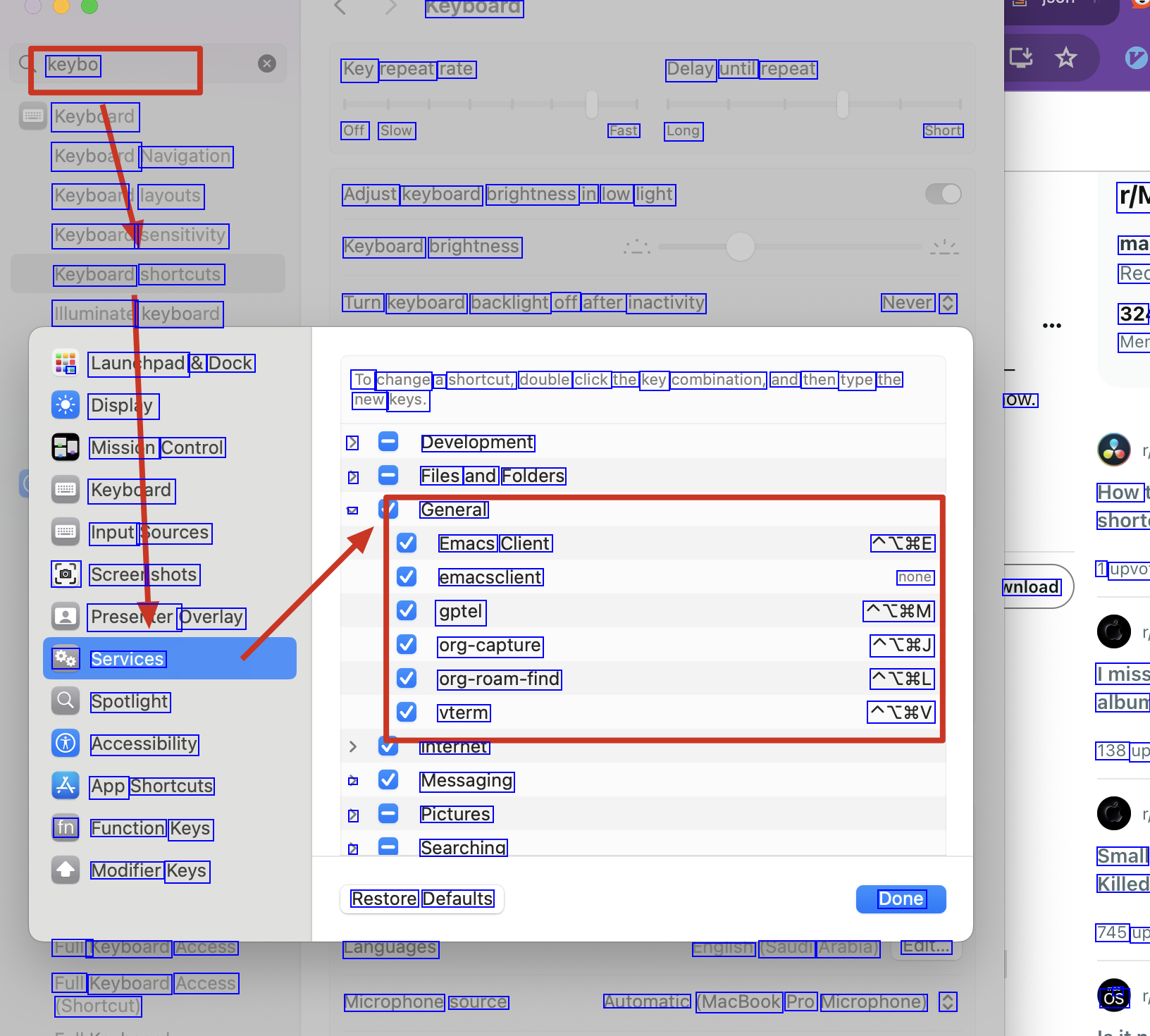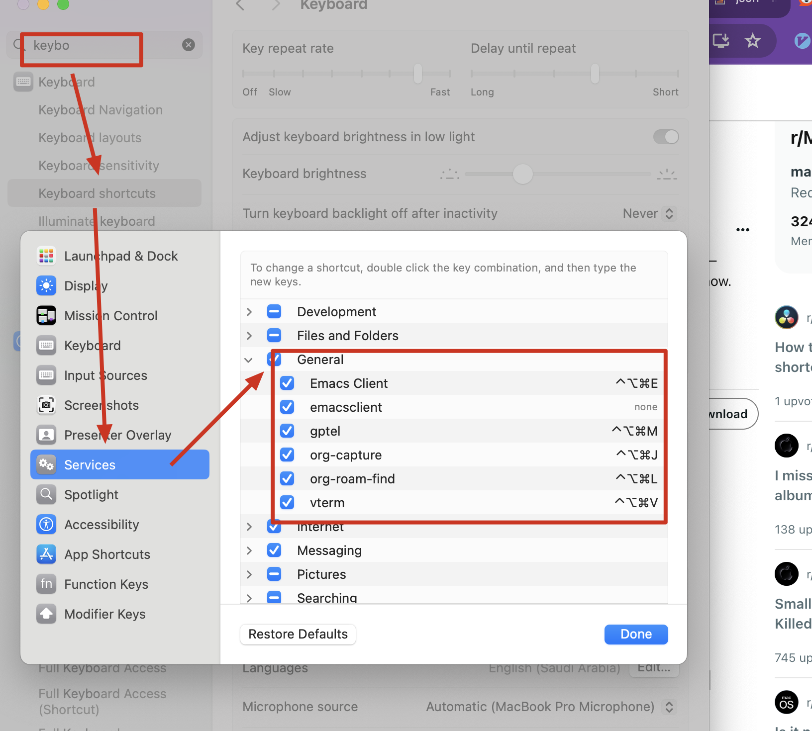 Keyboara keybo Keybdard Keyboard Navigation Keyboan layouts Keyboard sensitivity Keyboard shortcuts Illuminate keyboard - Launchpad & Dock Display Mission Control Keybdard Input Sources al Screer shots Preseler Overlay do Services Spotlight Accessibility App Shortcuts fn Function Keys Modifier Keys Key repeat rate Off Slow Delay until repeat Fast Long Short Adjust keyboard brightness in low light r/M ma Rec 32 Mer Keyboard brightness Turn keyboard backlight off after inactivity Never C To change a shortcut, double click the key combination, and then type the new keys. > > V OW. Development Files and Folders General Emacs Client emacsclient gptel org-capture org-roam-find vterm internet Messaging Pictures Searching Restore Defaults Languages Microphone source How short 1 upvo ATSE none ATSM ATIJ ATIL ATIV vnload Imiss album 138 up > > > Small Killed 745 up a OS Done FUllT Keyboard Access Full Keyboard Access (Shortcut) Engisn (Saudi Arabia) Eait... Automatic (MacBook Pro Microphone) C