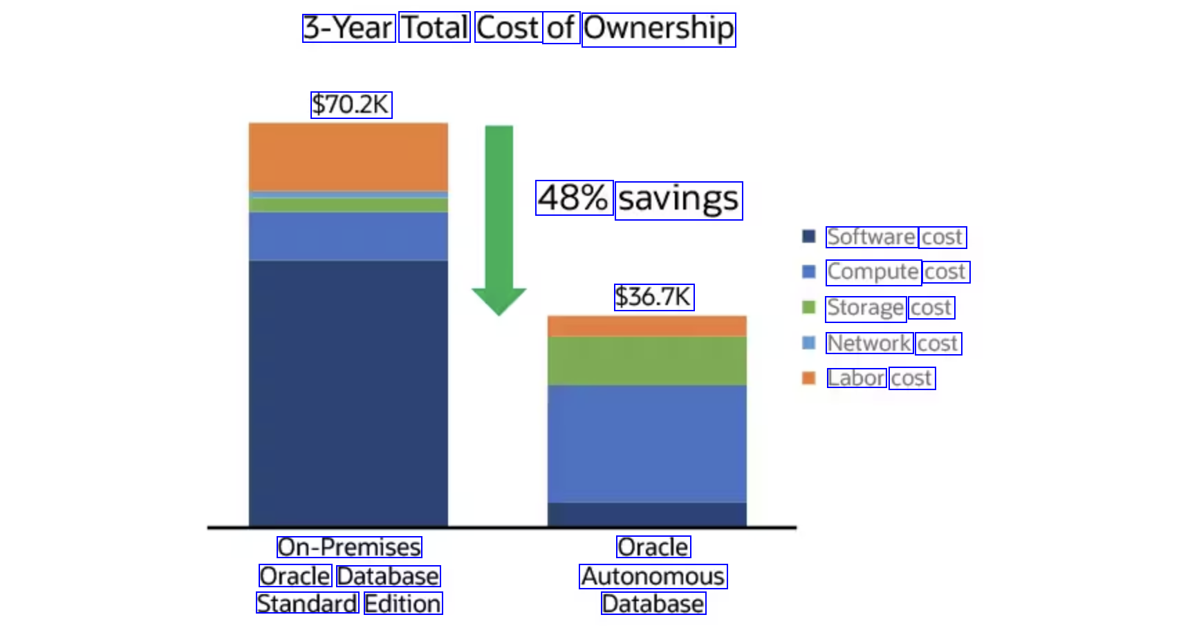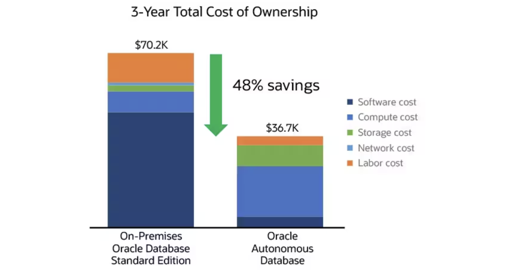 3-Year Total Cost of Ownership $70.2K 48% savings Software cost Compute cost Storage cost Network cost Labor cost $36.7K On-Premises Oracle Database Standard Edition Oracle Autonomous Database
