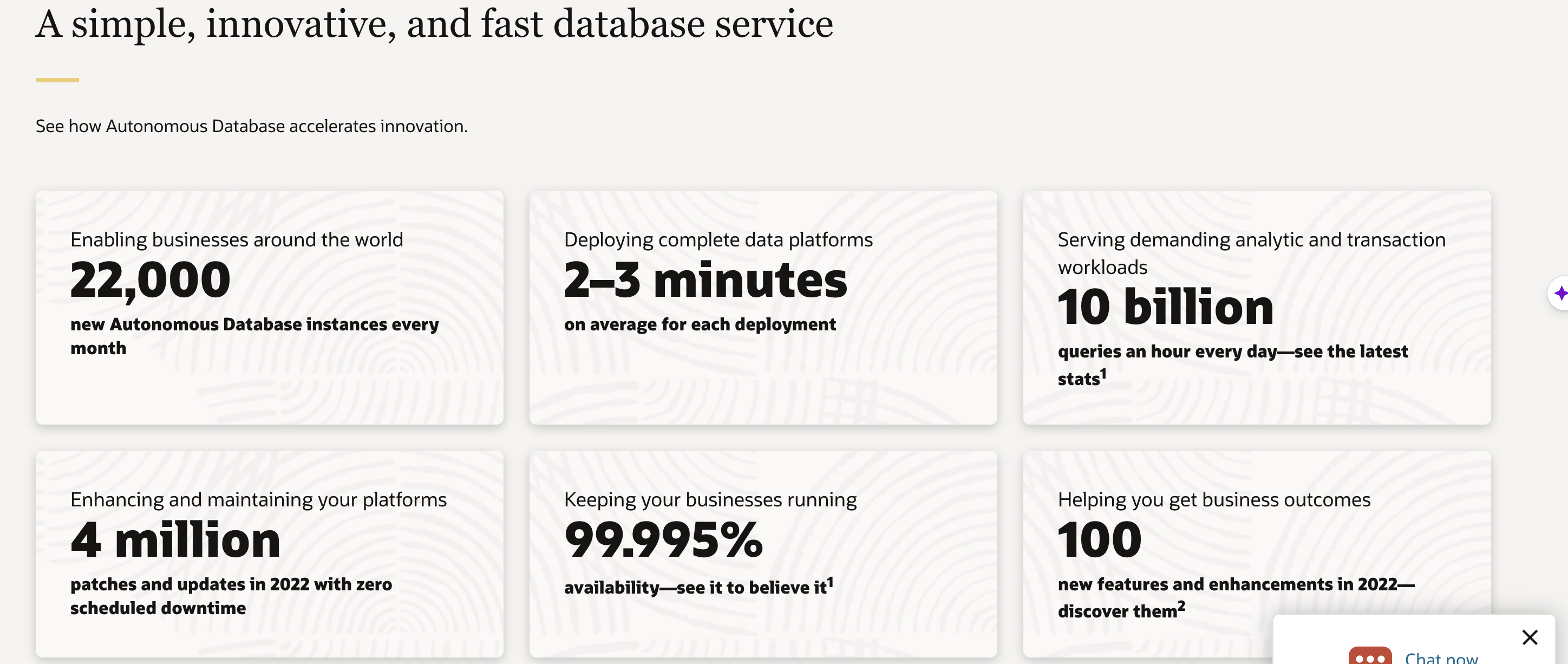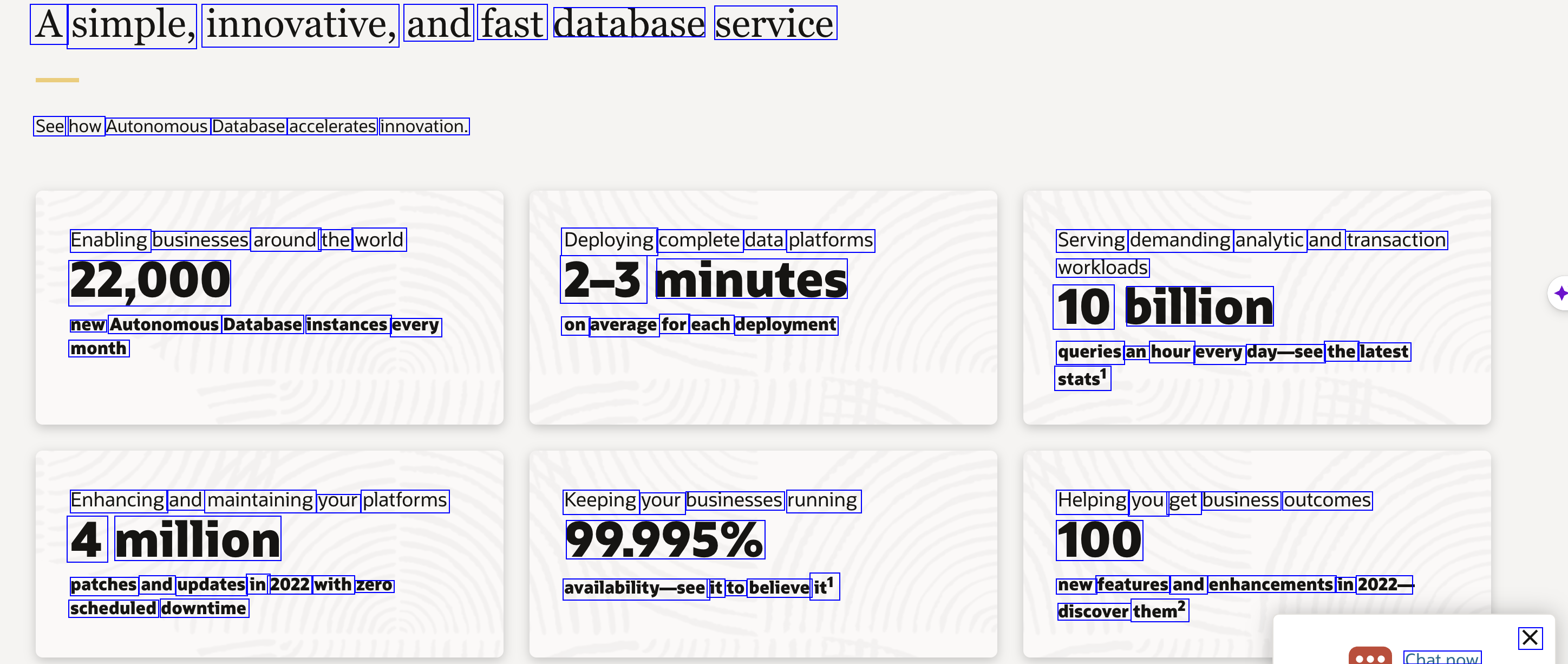 A simple, innovative, and fast database service See how Autonomous Database accelerates innovation. Enabling businesses around the world Deploying complete data platforms 2-3 minutes Serving demanding analytic and transaction workloads 10 22,000 new month billion Autonomous Database instances every on average for each deployment queries an hour every day-see the latest stats' Enhancing and maintaining your platforms Keeping your businesses running 99.995% Helping you get business outcomes 4 million 100 patches and updates in 2022 with zero scheduled downtime availability-see it to believe it' new features and enhancements in 2022- discover them? X Chatnow