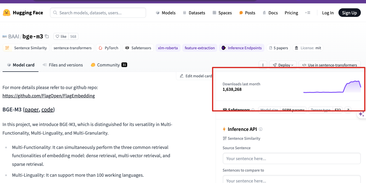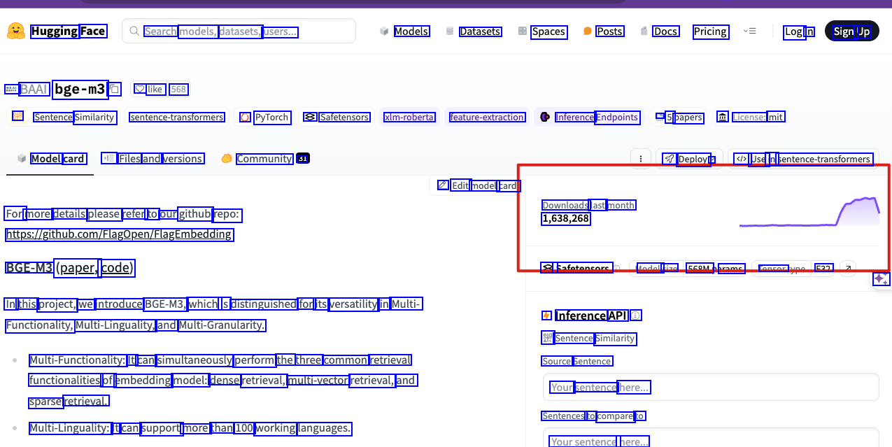 Hugging Face Search models, datasets, users... Models Datasets Spaces Posts Docs Pricing Log In Sign Up HAN BAAI bge-m3 a 9 like 568 P Sentence Similarity sentencetransformers 0 PyTorch 8 Safetensors xlm-roberta feature-extraction Inference Endpoints - 5 papers m License: mit Model card E Files and versions Community 31 3 Deploy V <> Use in sentence-transformers a Edit model card Downloads last month 1,638,268 For more details please refer to our github repo: https:lIgithub.com/FlagOpen/FlagEmbedding BGE-M3 (paper, code) Safatancare Aadal cize 56OM arame Tancar 522 +* In this project, we introduce BGE-M3, which is distinguished for its versatility in Multi- 4 Inference API @ 212 Sentence Similarity Source Sentence Functionality, Multi-Linguality, and Multi-Granularity. Multi-Functionality: It can simultaneously perform the three common retrieval functionalities of embedding model: dense retrieval, multi-vector retrieval, and Your sentence here... sparse retrieval. Sentences to compare to Yoursentence here... Multi-Linguality: It can support more than 100 working languages.