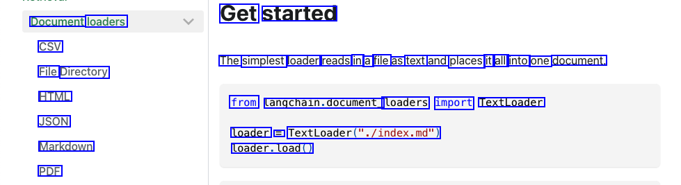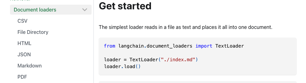 Get started Document loaders CSV The simplest loader reads in a file as text and places it all into one document. File Directory HTML from Langchain.document_ loaders import TextLoader JSON loader = TextLoader("./index.md") Markdown loader.load() PDF