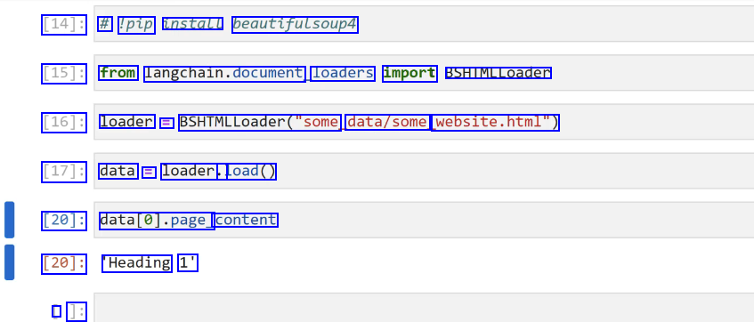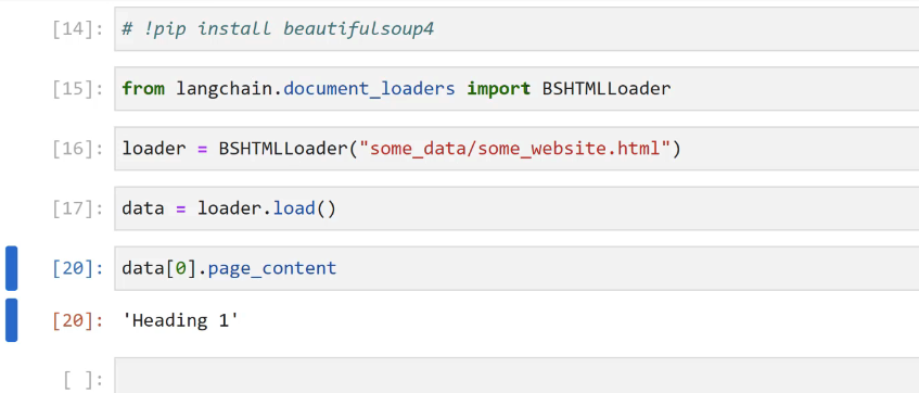 [14]: # 'pip install beautifulsoup4 [15]: from langchain.document loaders import BSHTMLLoader [16]: loader = BSHIMLLoader("some data/some website.html") [17]: data E loader.. load() [20]: datal0].page_ content [20]: Heading 1' I ]: