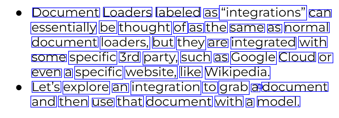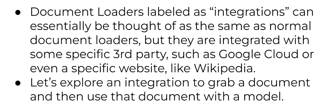 Document Loaders labeled as "integrations" can essentially be thought of as the same as normal document loaders, but they are integrated with some specific 3rd party, such as Google Cloud or even a specific website, like Wikipedia. Let's explore an integration to grab a - document and then use that document with a model.