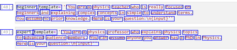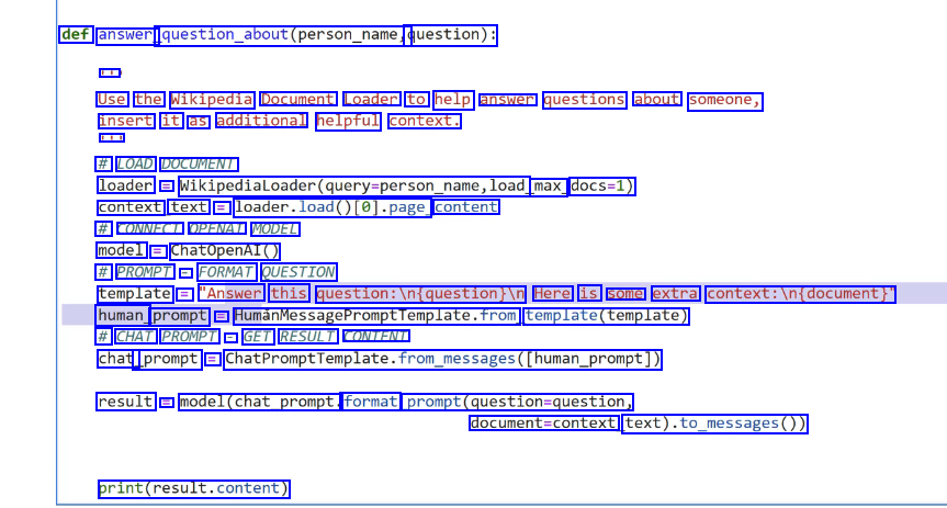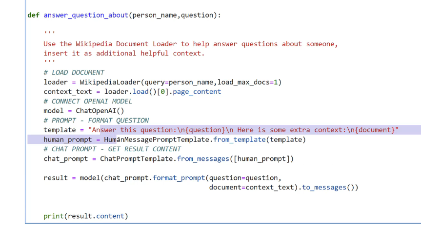 def answer question_about(pout(person_name, question): - Use the Wikipedia Document Loader to help answer questions about someone, insert it as additional helpful context. - # LOAD DOCUMENT loader = Wikipedialoader(query-person_name,load max_ docs=1) context text = loader.load0te)-page content # CONNECT OPENAI MODEL model = ChatOpenAI() # PROMPT - FORMAT QUESTION template = "Answer this question:in(question)In Here is some extra context:ln(document) human prompt == HumanMessagePromptromptremplate.from template(template) # CHAT PROMPT - GET RESULT CONTENT chat _prompt = ChatPromptTemplate.from.pessages(Iuman_prompt)) result = model(chat_prompt. format prompt(question-question, document-context text).to.messages0) print(result.content)