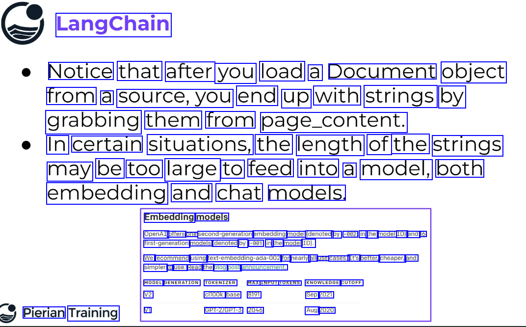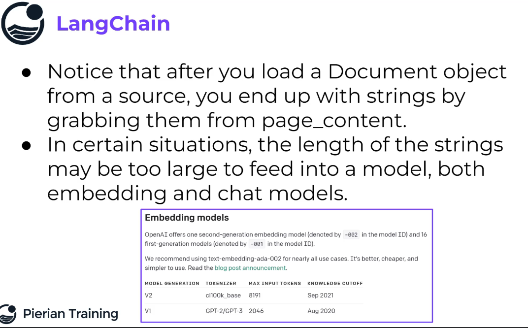 LangChain Notice that after you load a Document object from a source,you end up with strings by grabbing them from page_content. In certain situations, the length of the strings may be too large to feed into a model, both embedding and chat models. Embedding models OpenAI offers one second-generation embedding model (denoted by -002 in the model ID) and 16 first-generation models (denoted by -001 in the model ID). We recommend using text-embedding-ada-002 for nearly all use cases. It's better, cheaper, and simpler to use. Read the blog post announcement. MODEL GENERATION TOKENIZER MAX INPUT TOKENS KNOWLEDGE CUTOFF V2 V1 cl100k_ base 8191 GPT-2/GPT-3 2046 Sep 2021 Aug 2020 Pierian Training