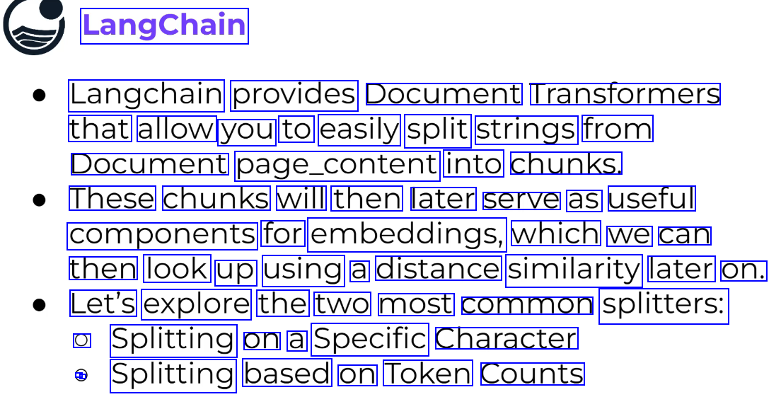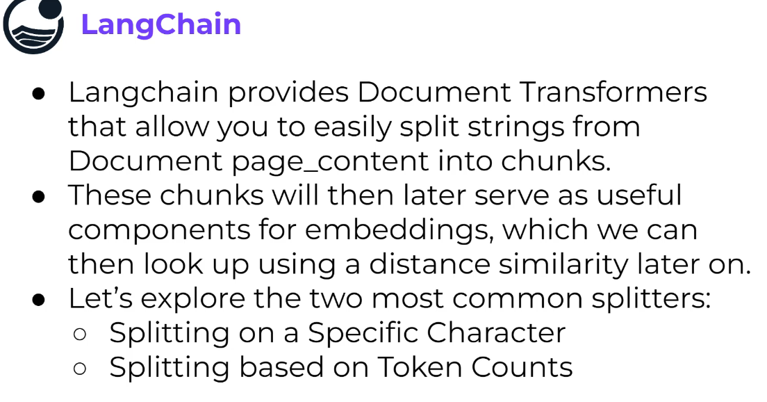 LangChain Langchain provides Document Transtormers that allow you to easily split strings from Document page_content into chunks. These chunks will then later serve as useful components for embeddings, which we can then look up using a distance similarity later on. Let's explore the two most common splitters: O Splitting on a Specific Character - - Splitting based on Token Counts
