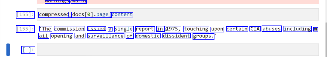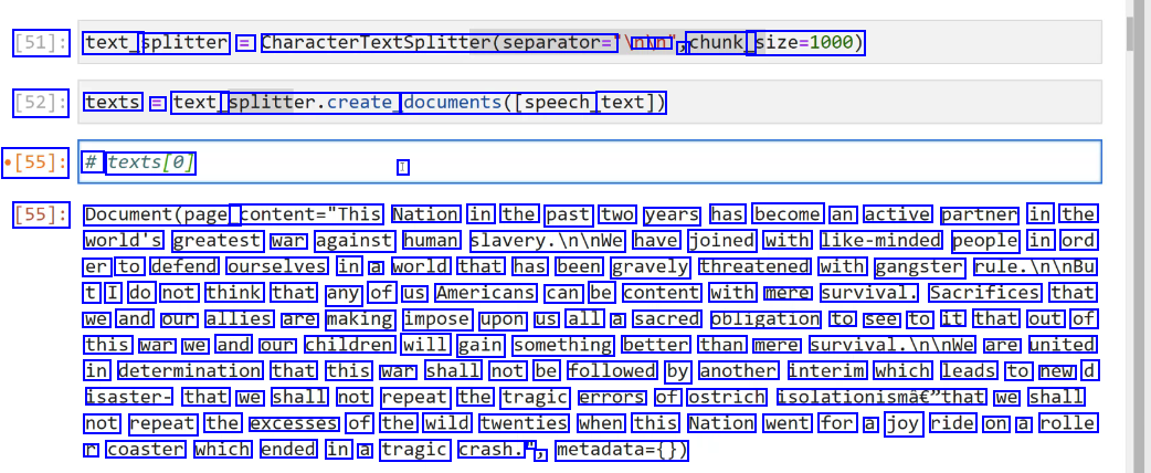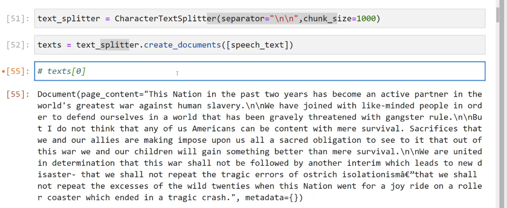 [51]: text_ splitter = CharacterTextSplitter(separator= nu un J chunk_ size=1000) [52]: texts = text_ splitter.create, documents(Ispeech, text]) [55]: # texts(e] I [55]: Document(page_ content="This Nation in the past two years has become an active partner in the world's greatest war against human slavery.Ininwe have joined with like-minded people in ord er to defend ourselves in a world that has been gravely threatened with gangster rule.IninBu t I do not think that any of us Americans can be content with mere survival. Sacrifices that we and our allies are making impose upon us all a sacred obligation to see to it that out of this war we and our children will gain something better than mere survival.Ininwe are united in determination that this war shall not be followed by another interim which leads to new d isaster- that we shall not repeat the tragic errors of ostrich isolationismâe"that we shall not repeat the excesses of the wild twenties when this Nation went for a joy ride on a rolle r coaster which ended in a tragic crash. l J metadata=0)