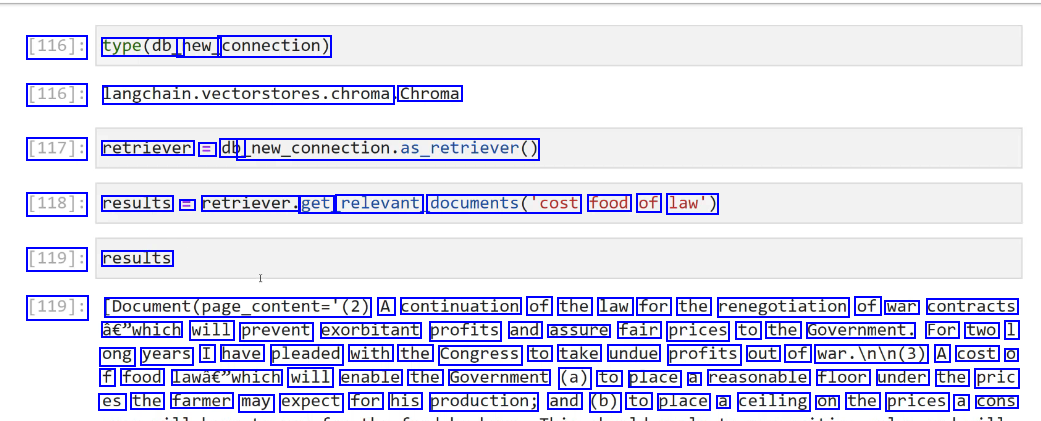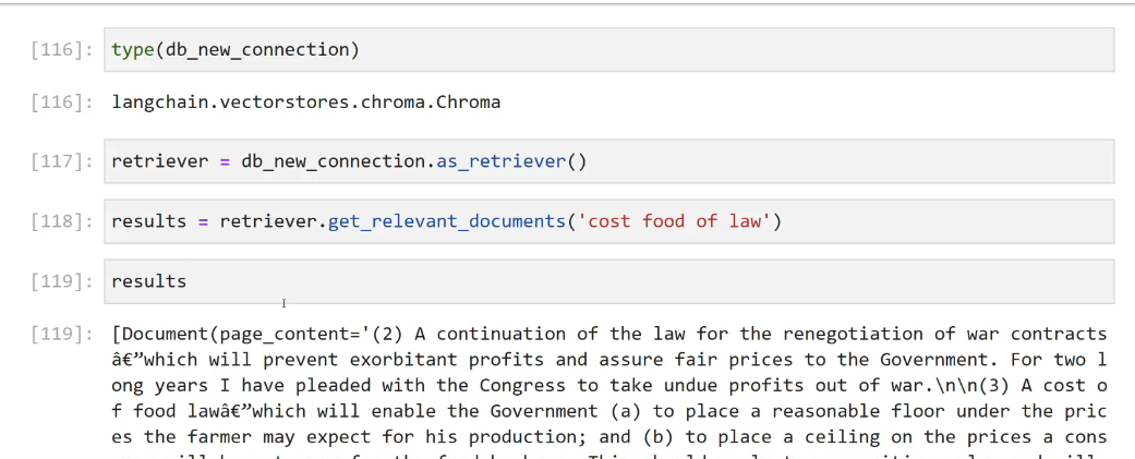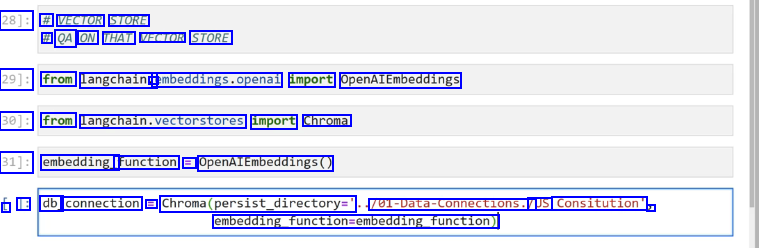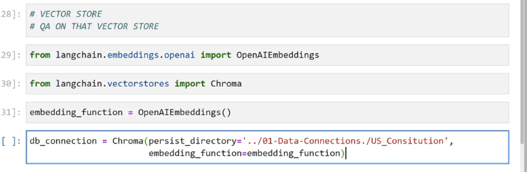 28]: # VECTOR STORE # QA ON THAT VECTOR STORE 29]: from langchain. - embeddings.openal import OpenAIEmbeddings 30]: from langchain.vectorstores import Chroma 31]: embedding_ function = OpenAIEmbeddings0 L 1: db_ connection = Chroma(persist_directory=' 701-Data-Connections./ /US Consitution" 3 embedding_function-embedding_function)